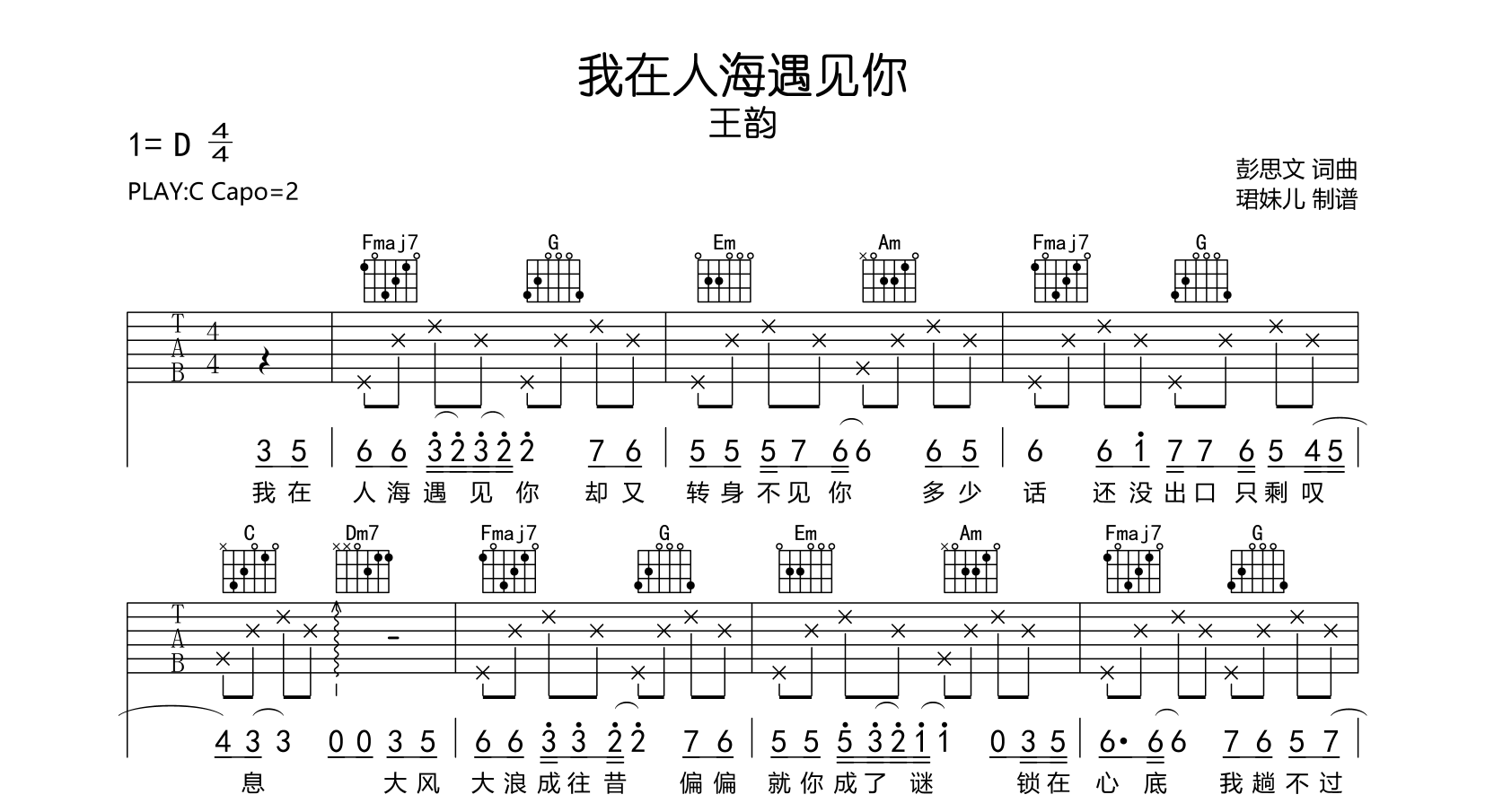曲谱介绍: 王韵《我在人海遇见你》吉他弹唱谱,采用C调指法编配,共有2张高清图谱,免翻页排版设计。