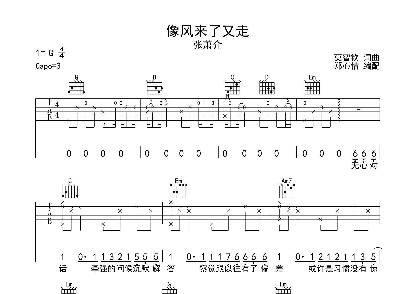 曲谱介绍: 张萧介《像风来了又走》吉他弹唱谱,采用G调指法编配,共有2张高清图谱,免翻页排版设计。