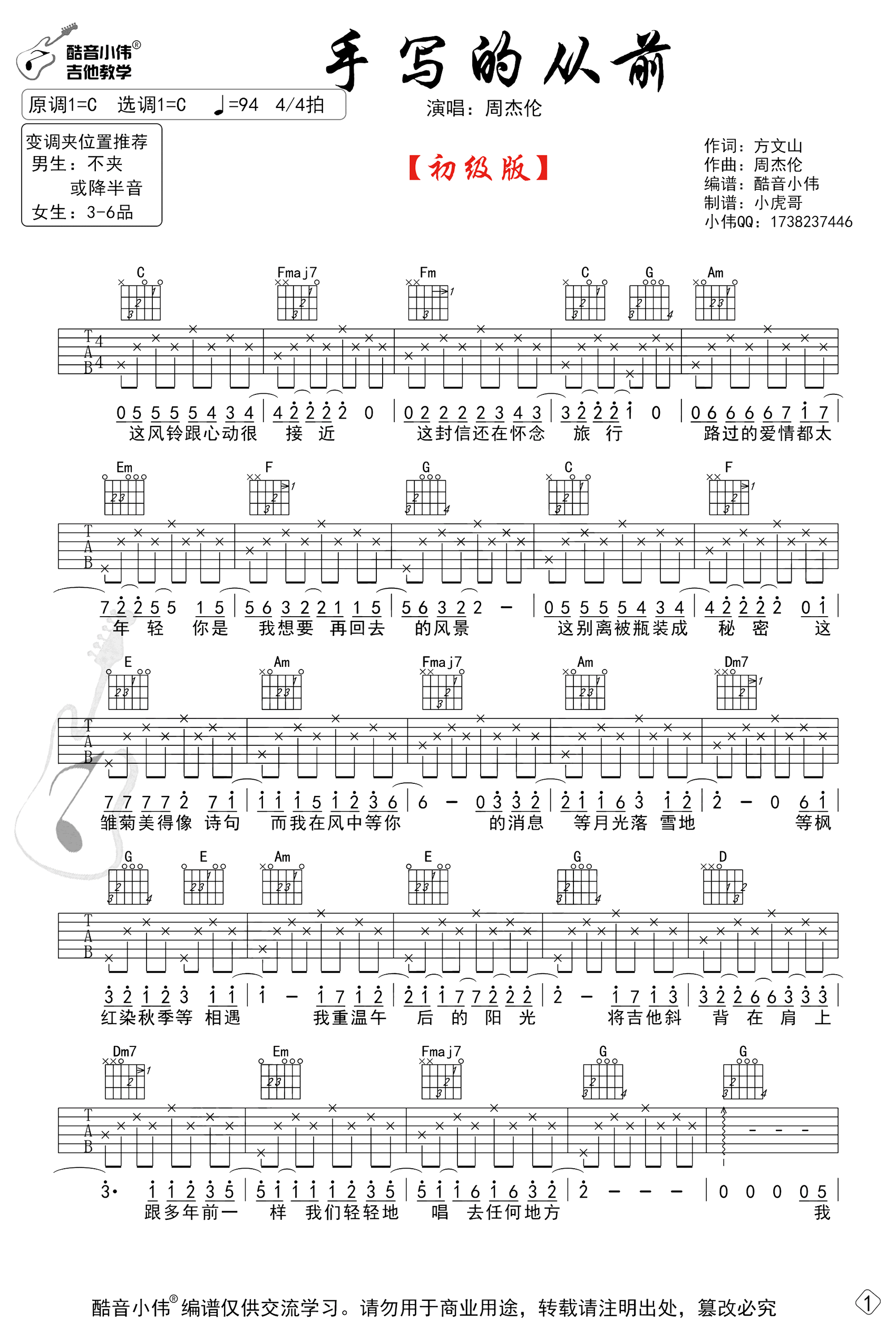 曲谱介绍: 周杰伦《手写的从前》吉他弹唱谱,采用C调指法编配,共有3张高清图谱。