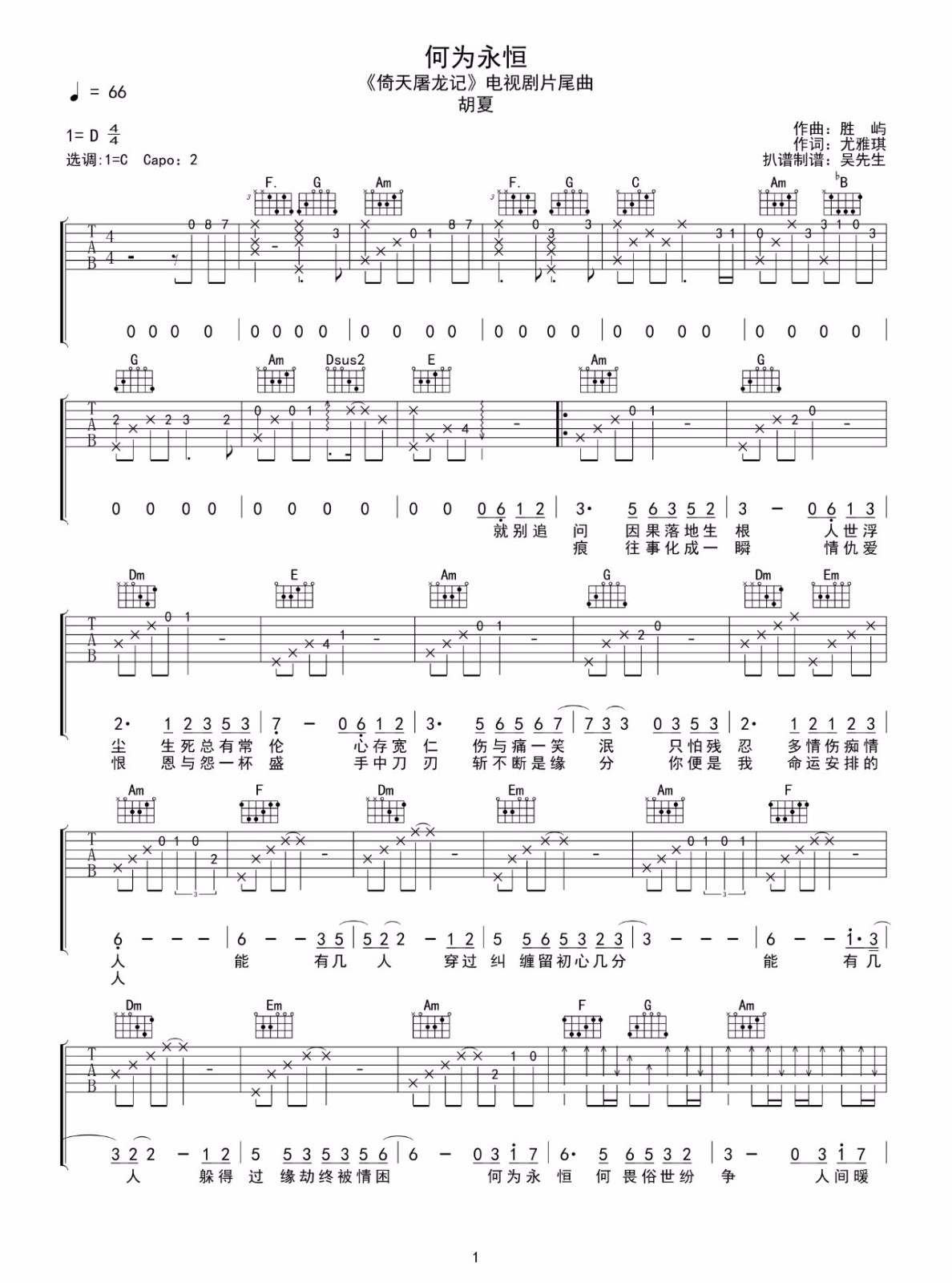 曲谱介绍: 胡夏《何为永恒》吉他弹唱谱,采用C调指法编配原版,共有2张高清图谱,免翻页排版设计。