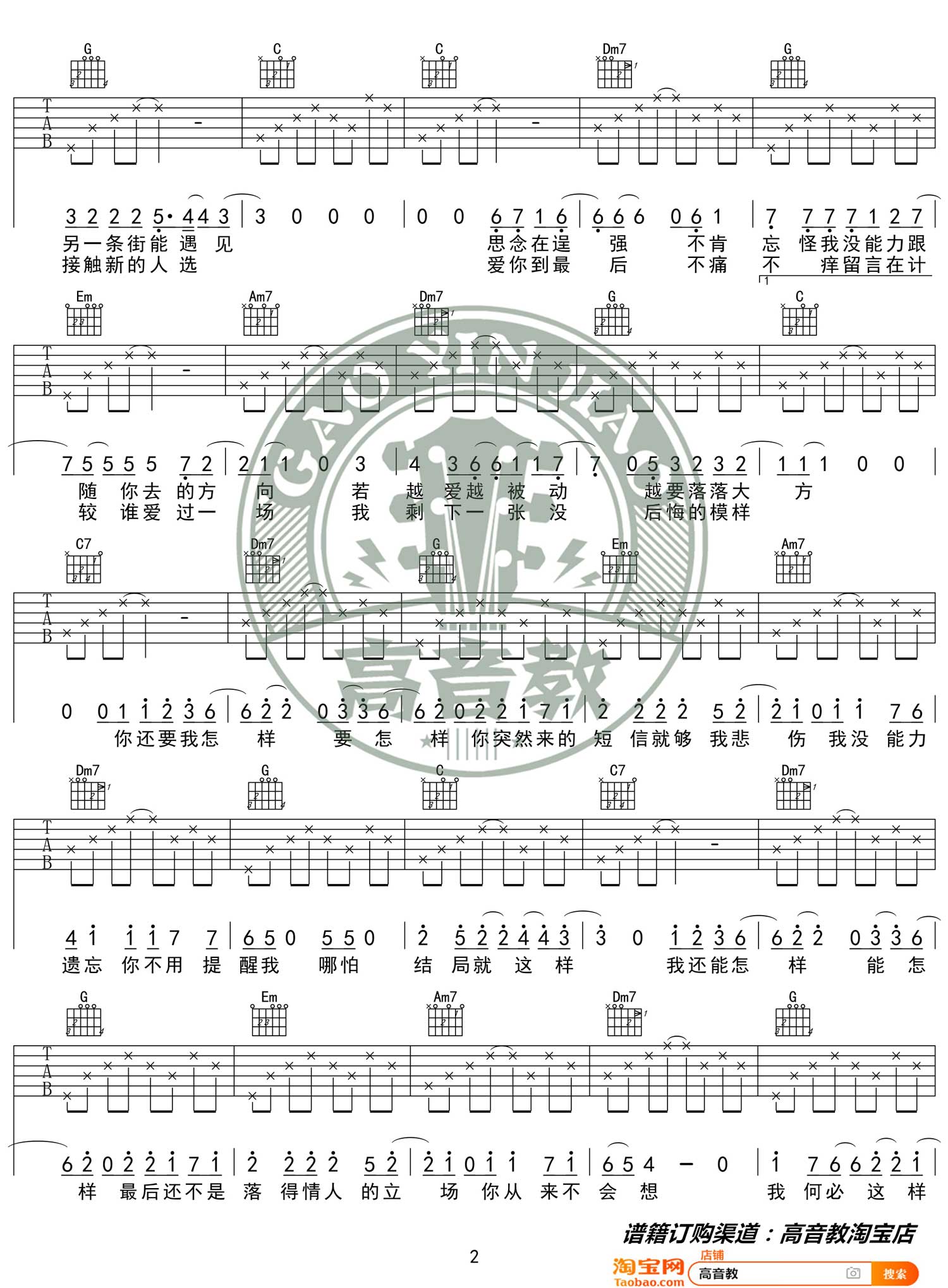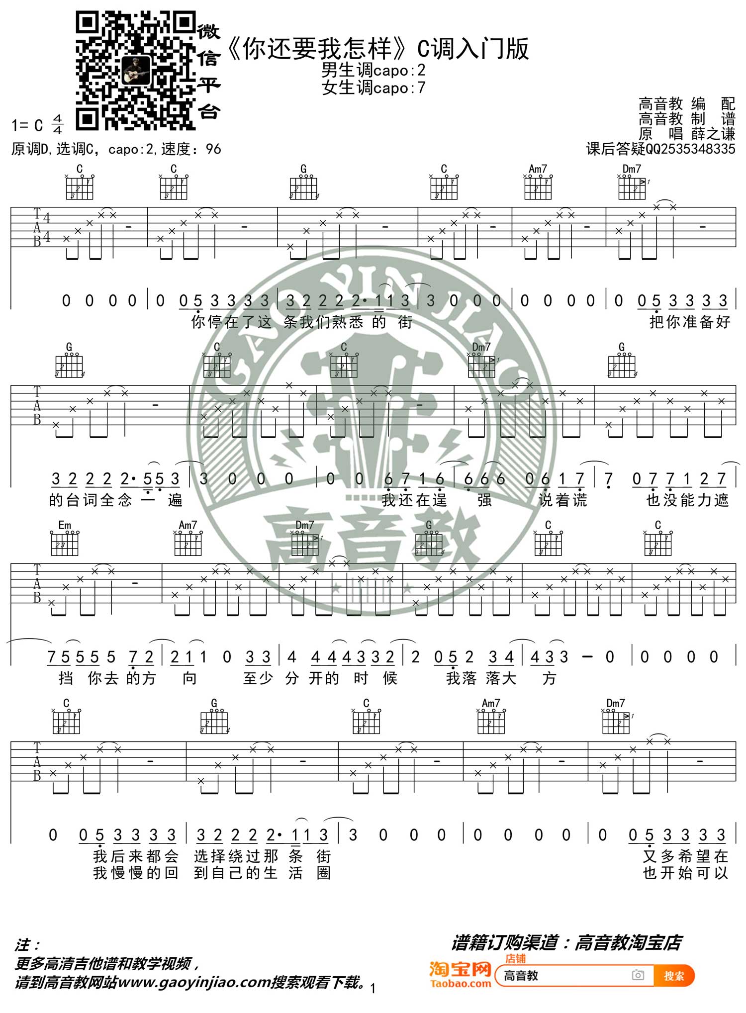 曲谱介绍: 薛之谦《你还要我怎样》吉他弹唱谱,采用C调指法编配,共有4张高清图谱。