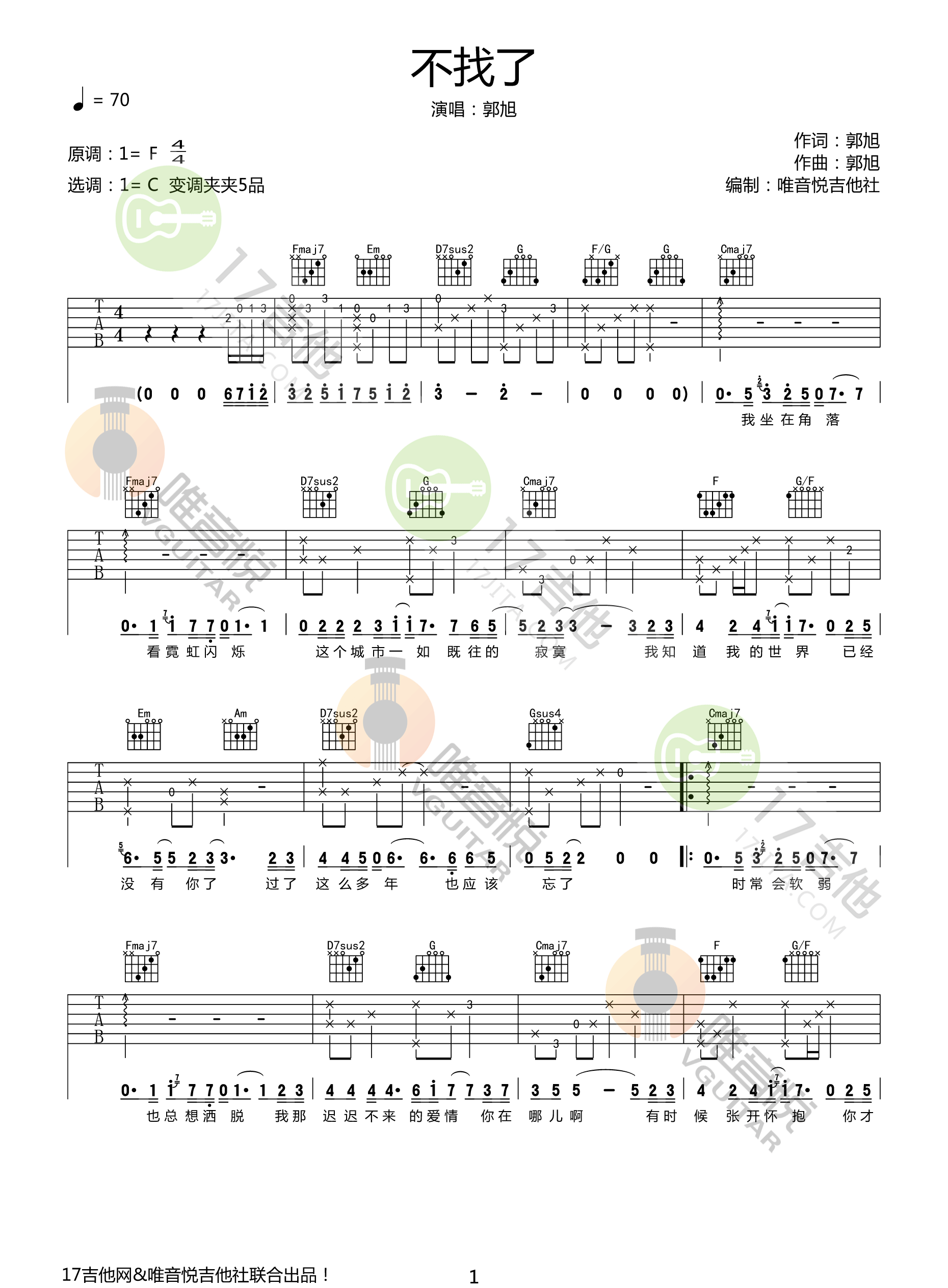 不找了吉他谱 - 郭旭 - C调吉他弹唱谱 - 原版