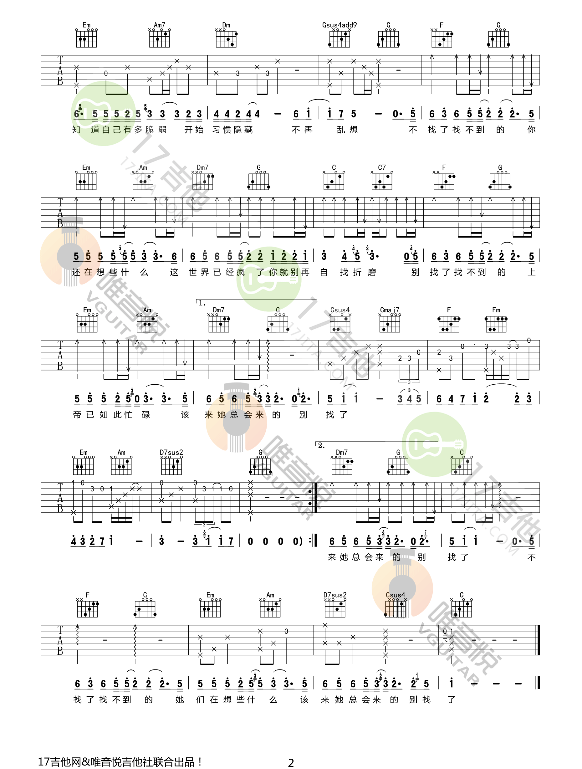 曲谱介绍: 郭旭《不找了》吉他弹唱谱,采用C调指法编配原版,共有2张高清图谱,免翻页排版设计。