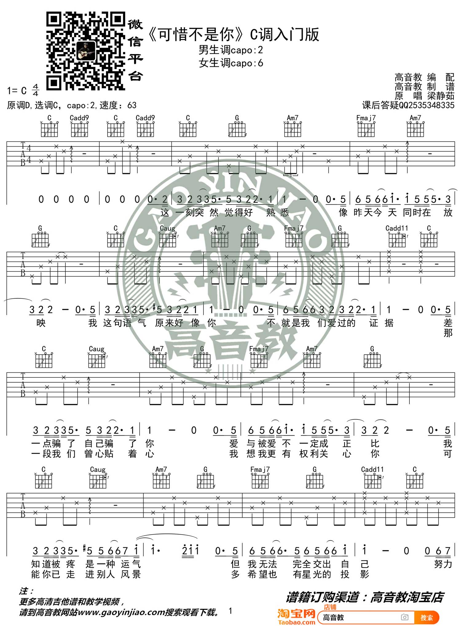 曲谱介绍: 梁静茹《可惜不是你》吉他弹唱谱,采用C调指法编配,共有2张高清图谱,免翻页排版设计。