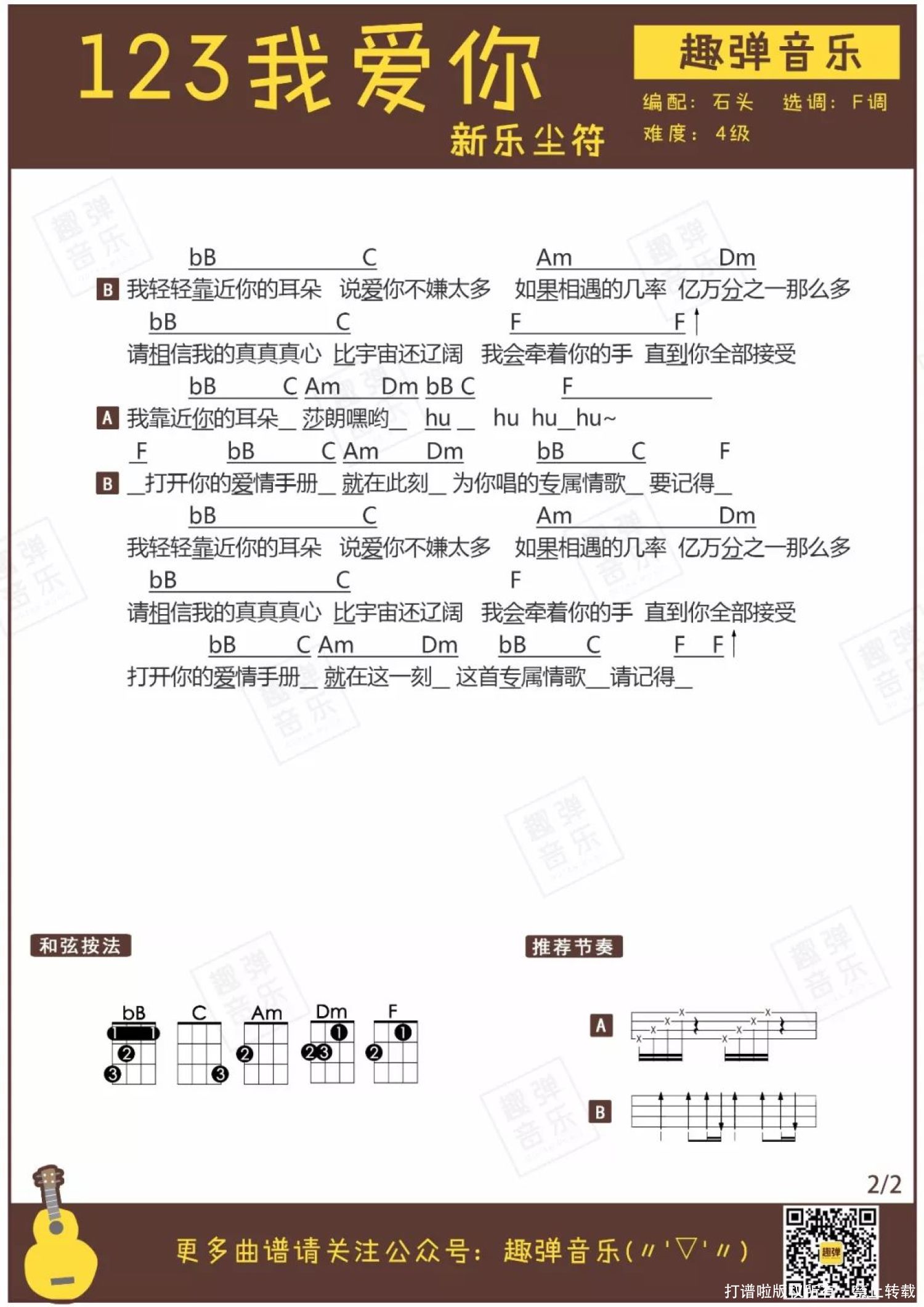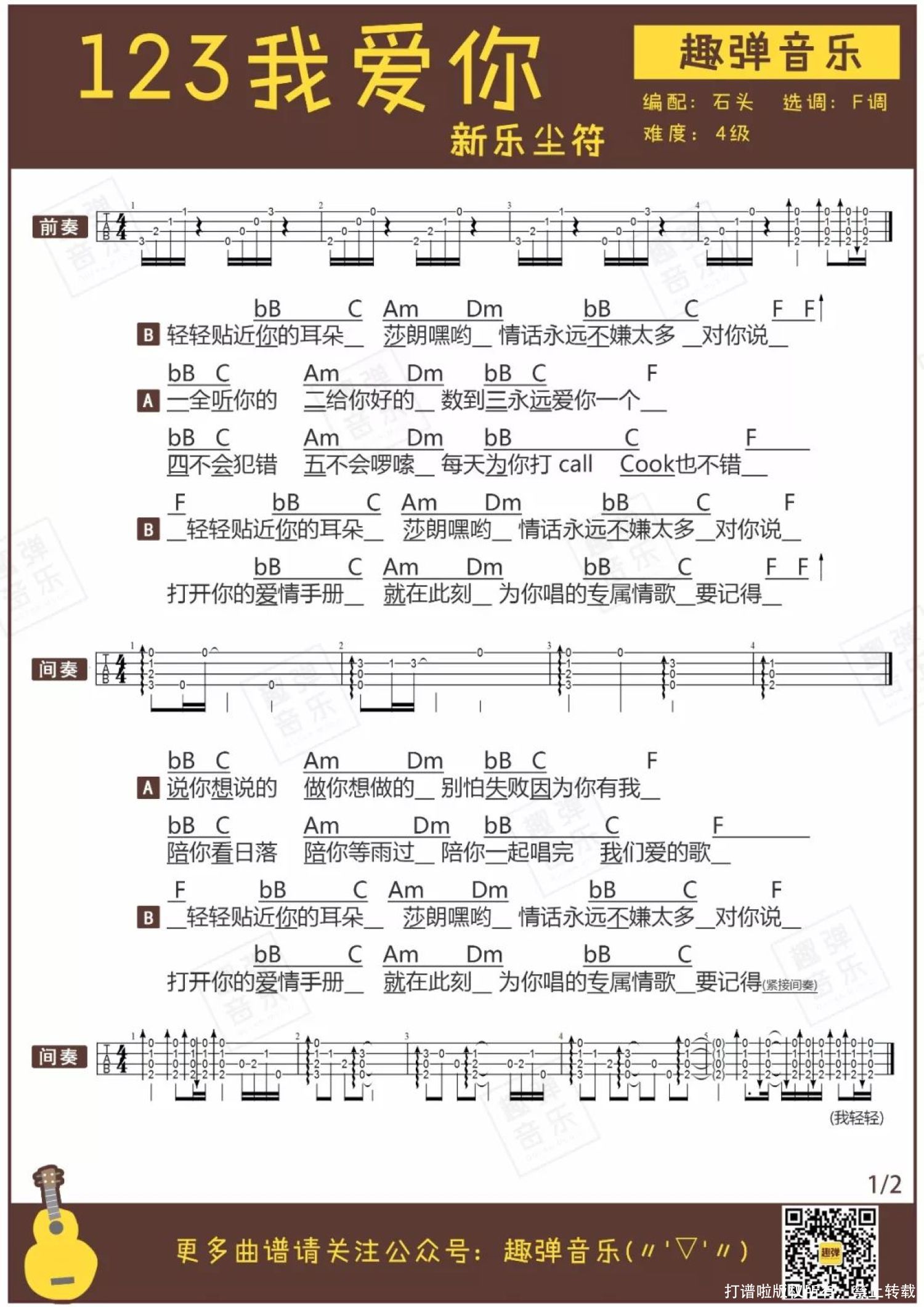 曲谱介绍: 进入二月份,随着某个成双成对的节日临近,空气中已经隐隐弥漫着一股恋爱的酸臭……呃不是,恋爱的甜蜜味道。 想到自己喜欢的人,心情一定又柔软又甜蜜,幸福得要冒出粉色泡泡吧。那种甜丝丝的味道,是不是和今天的这首弹唱一样呢? (2分15秒 萌萌哒客串嘉宾上线~)   弹唱MV   关于这首歌儿 ● 新乐尘符出品的一首歌,贺子铃演唱,江潮作曲并演唱rap部分。 ● 因常被作为短视频软件手势舞音乐走红。 热恋中的小情侣们,是不是恨不得24小时都粘在一起呢?这首「123我爱你」分分钟猜中你们这些甜不拉几的小心思。 抖音等短视频软件让许多歌曲走红,这首歌也是因为经常被当作手势舞的音乐而被大家喜爱。在活泼可爱的歌曲节奏中,小姐姐们用手势舞发射的小心心,就算小编是女孩子也抵挡不住这样的甜蜜暴击!   而杏子小姐姐带来的Ukulele弹唱版本,甜蜜的嗓音中多了几分少女的柔软,听了让人好想谈恋爱!φ(>ω<*) 不久后就是情人节啦,你不想用这首充满恋爱气息的弹唱对他表白吗?趣弹君来送一波助攻,谱子就在前方!   弹唱曲谱