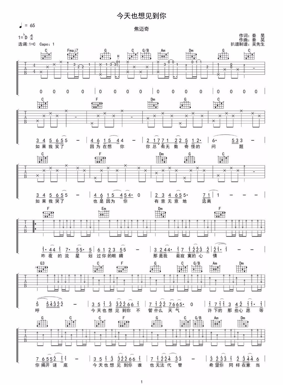 曲谱介绍: 焦迈奇《今天也想见到你》吉他弹唱谱,采用C调指法编配原版,共有2张高清图谱,免翻页排版设计。
