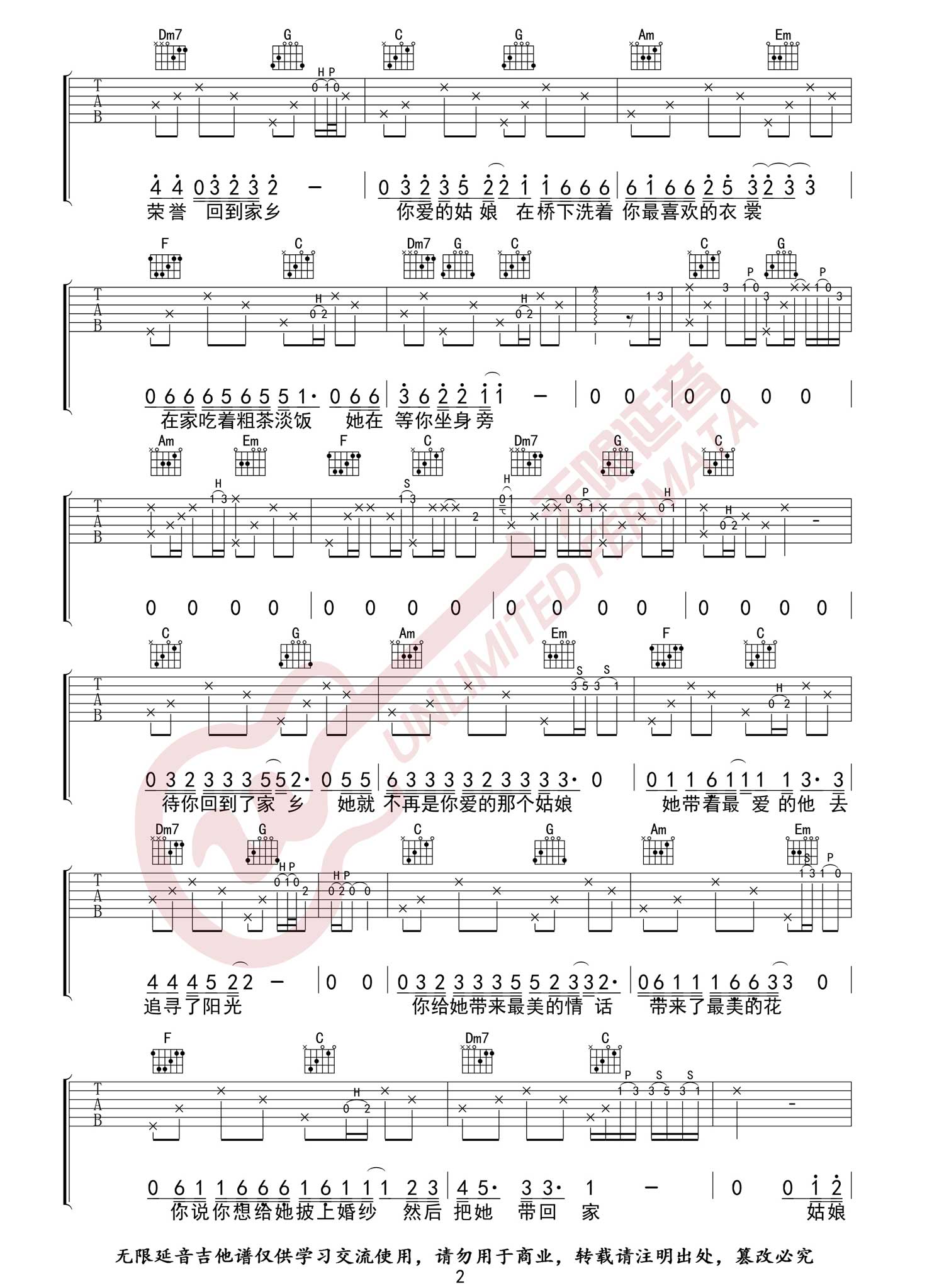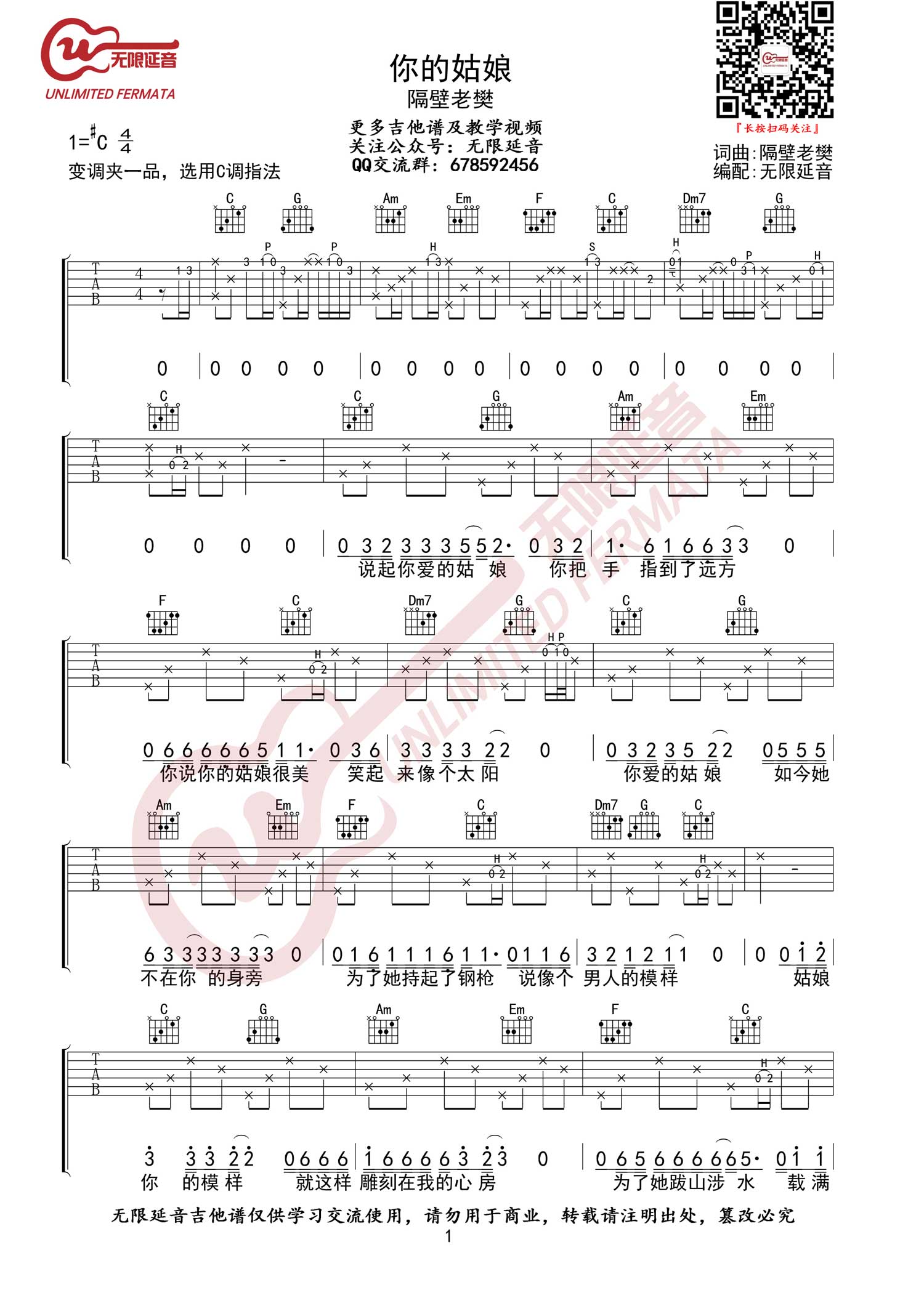 曲谱介绍: 隔壁老樊《你的姑娘》吉他弹唱谱,采用C调指法编配,共有3张高清图谱。
