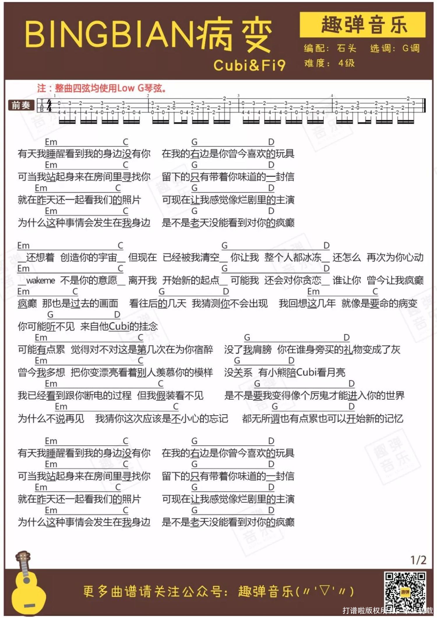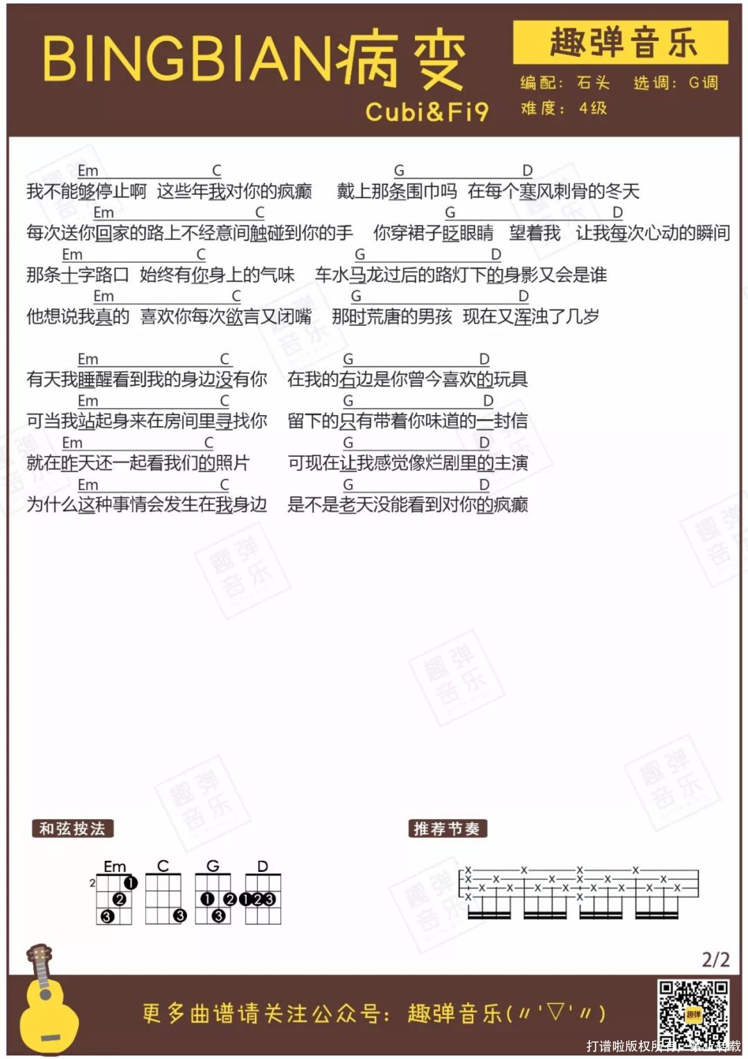 曲谱介绍: 天气越来越冷,取暖全靠抖的南方人每天只能抱着热水袋过活。天真的我以为,热情活泼小清新的尤克里里,在天寒地冻的季节可以退居二线了。 然而听了小哥哥小姐姐的这首弹唱,我瞬间被啪啪打脸。一首小U弹唱版的「BINGBIAN病变」,让我在一个又一个冬夜洗脑循环...   弹唱MV   关于这首歌 ● 歌曲名为「BINGBIAN病变」,原唱是名为Cubi/Fi9江澈/Birck的两位歌手。 ● 2017年6月发行后,在抖音软件上走红。 乍一看这乱码一般的歌曲名和歌手名,还以为是韩国组合BIGBANG的新歌。 许多短视频软件和直播软件上的翻唱让这首歌在去年火了起来,是一首讲述悲切爱情故事的情歌。歌词描述了分手后的寒冷冬夜里,一个人的寂寞与心痛。 不怕流氓有文化,就怕rapper说情话,这首歌歌词描写得很细腻,所以唱进很多人心里,是一首在冬夜里十分应景的歌。旋律舒缓慵懒,说唱部分又有几分帅气,歌曲有着一丝忧郁深沉的气息。 当清新可爱的Ukulele转型驾驭这样的黑暗曲风,竟然有点酷酷哒。而秋天和石头磁性而深沉的嗓音完美搭配,让「BINGBIAN病变」成为冬夜必需循环的歌曲之一!   弹唱曲谱