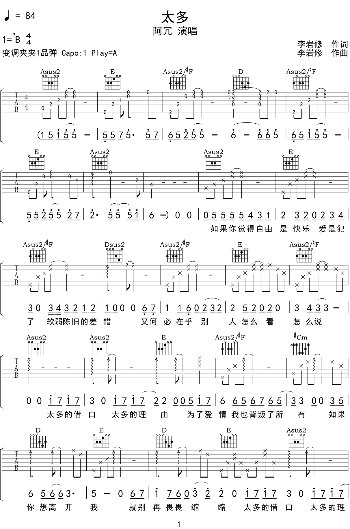 曲谱介绍: 阿冗《太多》吉他弹唱谱,采用A调指法编配原版,共有4张高清图谱。