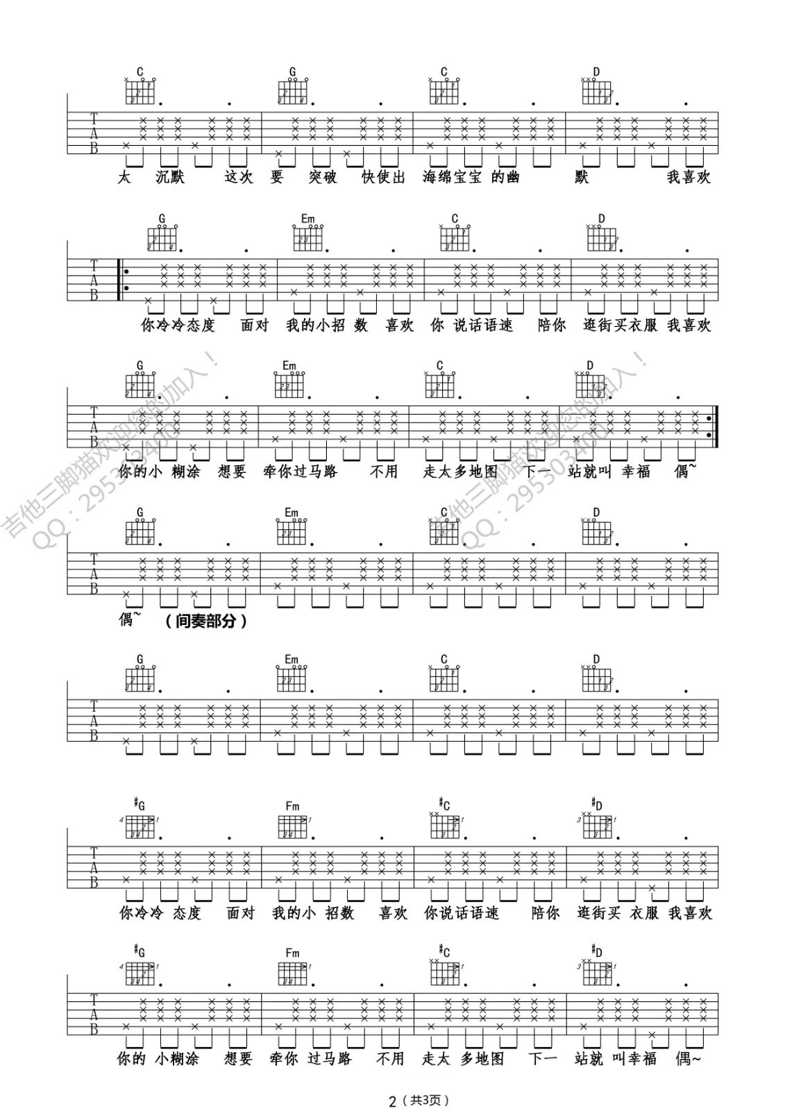 曲谱介绍: 回音哥《海绵宝宝》吉他弹唱谱,采用D调指法编配原版,共有3张高清图谱。