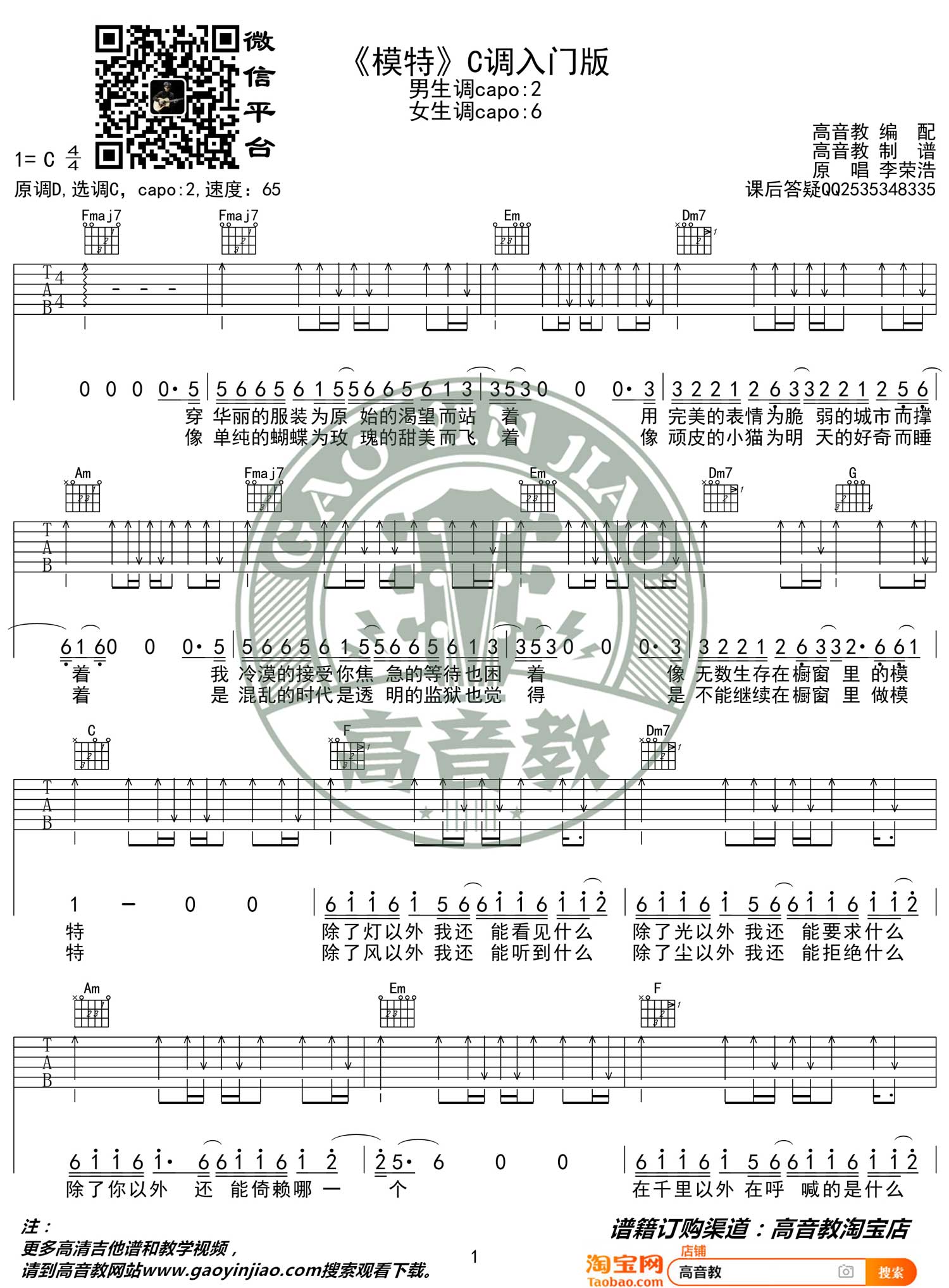 曲谱介绍: 李荣浩《模特》吉他弹唱谱,采用C调指法编配,共有2张高清图谱,免翻页排版设计。
