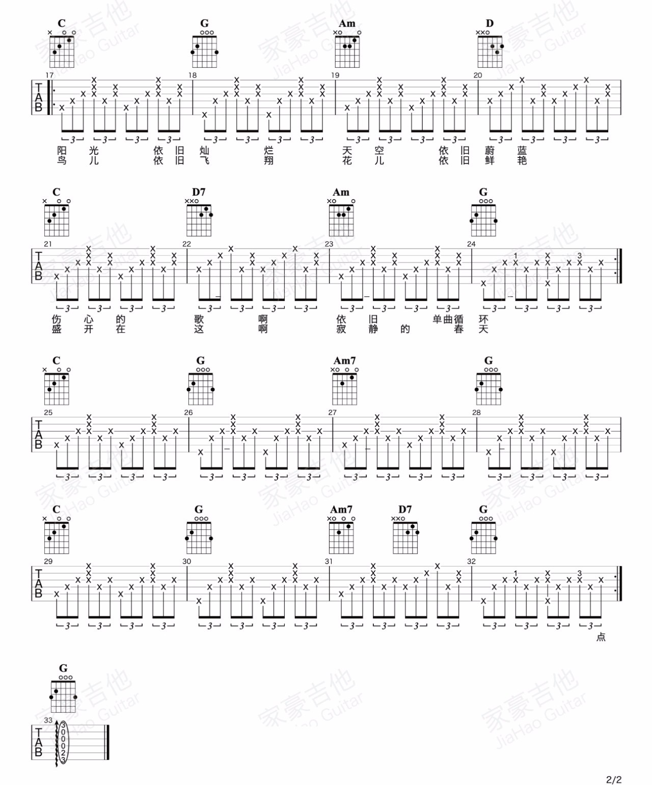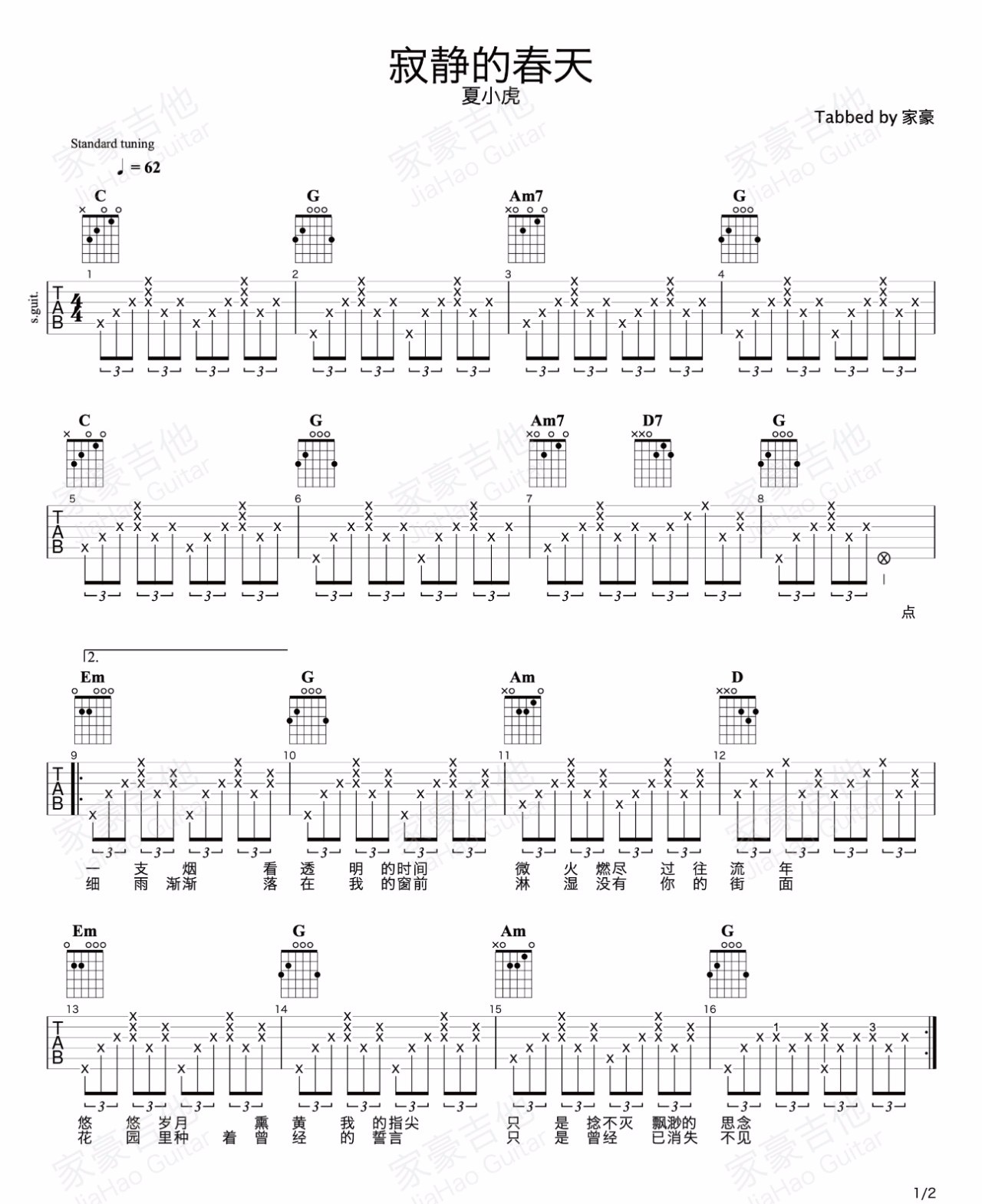 曲谱介绍: 夏小虎《寂静的春天》吉他弹唱谱,采用G调指法编配原版,共有2张高清图谱,免翻页排版设计。