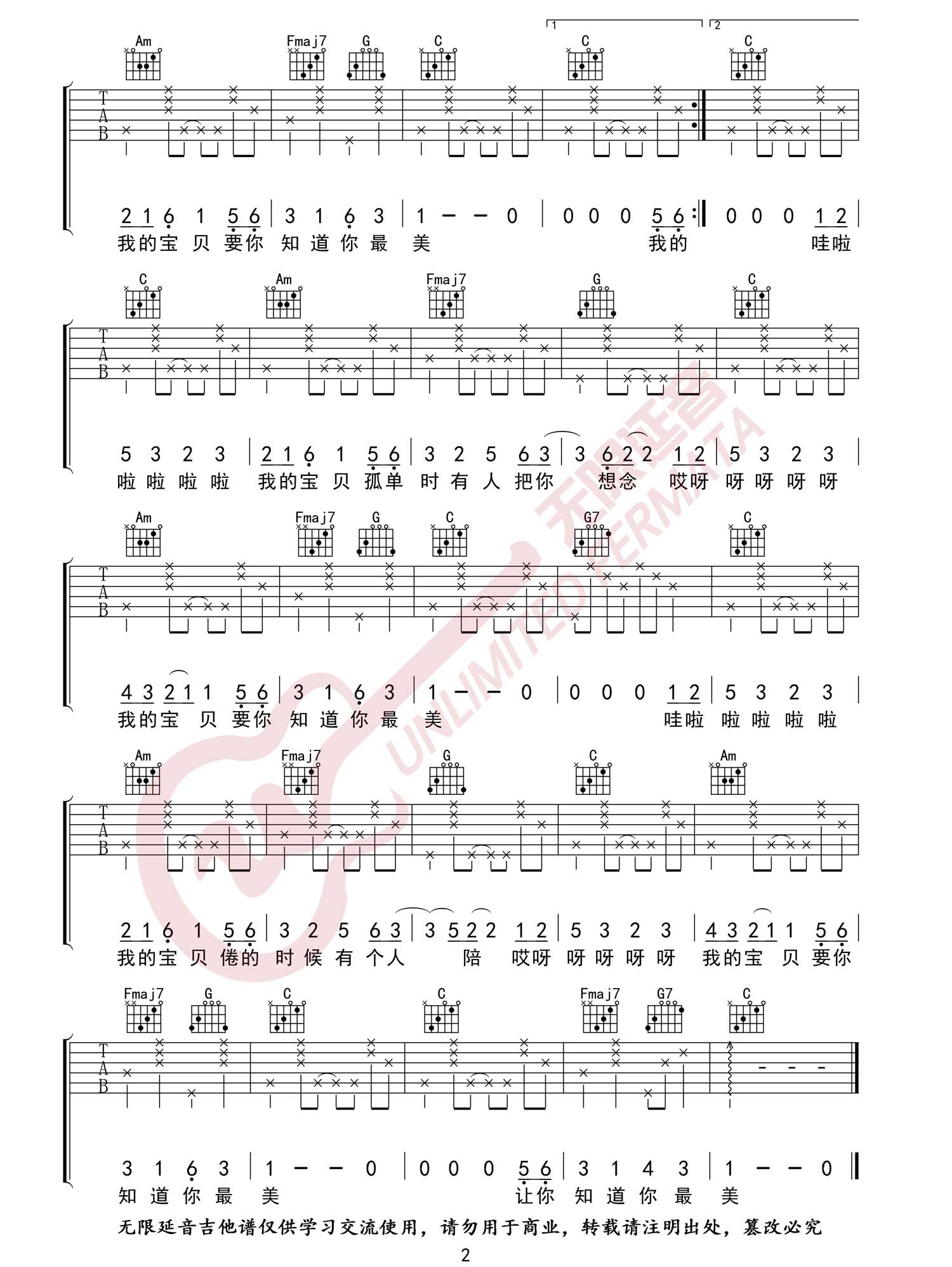 曲谱介绍: 张悬《宝贝》吉他弹唱谱,采用C调指法编配原版,共有2张高清图谱,免翻页排版设计。