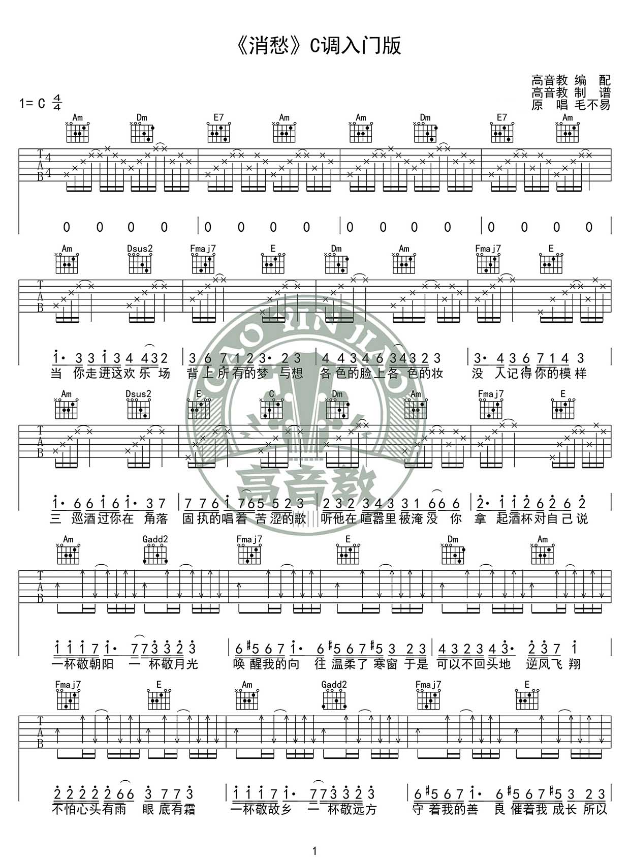 曲谱介绍: 毛不易《消愁》吉他弹唱谱,采用C调指法编配,共有2张高清图谱,免翻页排版设计。