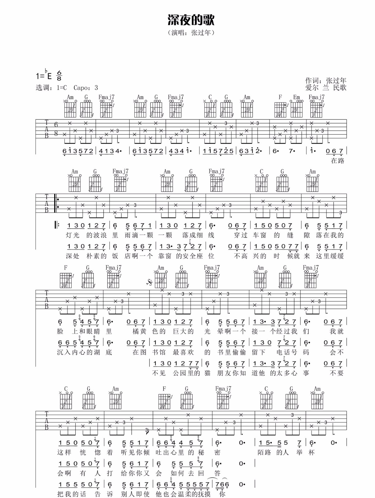 曲谱介绍: 张过年《深夜的歌》吉他弹唱谱,采用C调指法编配原版,共有2张高清图谱,免翻页排版设计。