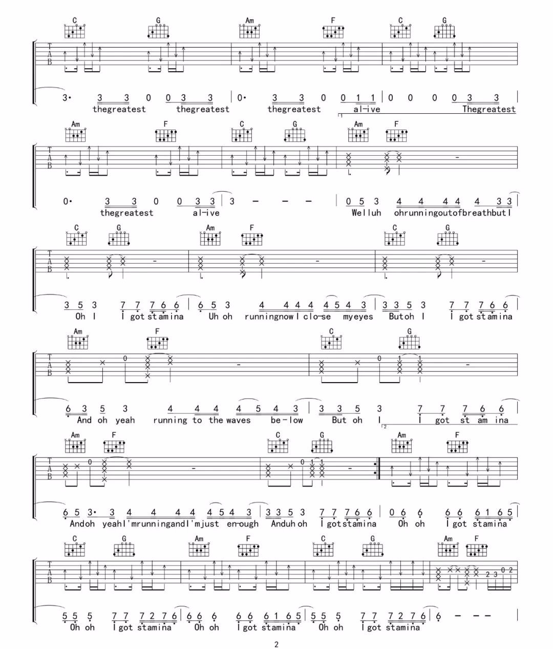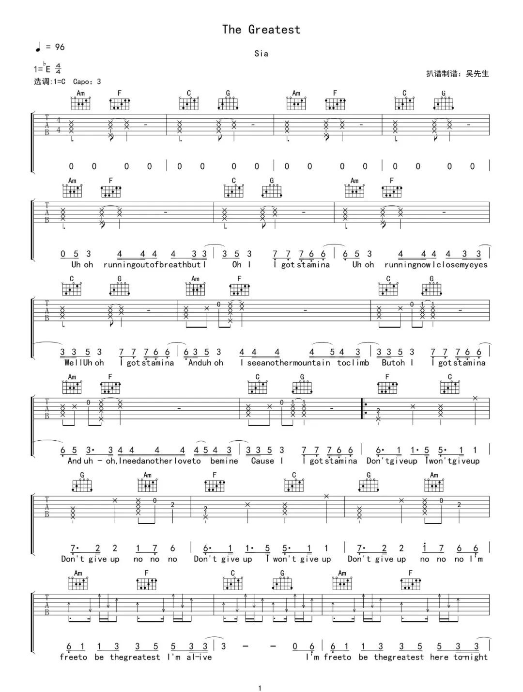 曲谱介绍: Sia《TheGreatest》吉他弹唱谱,采用C调指法编配原版,共有3张高清图谱。
