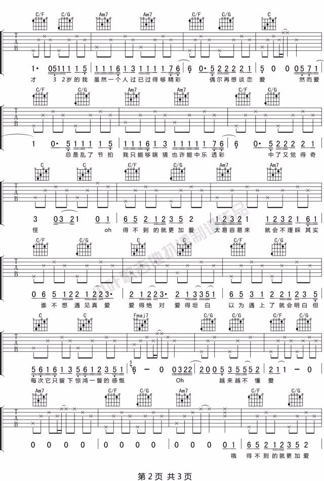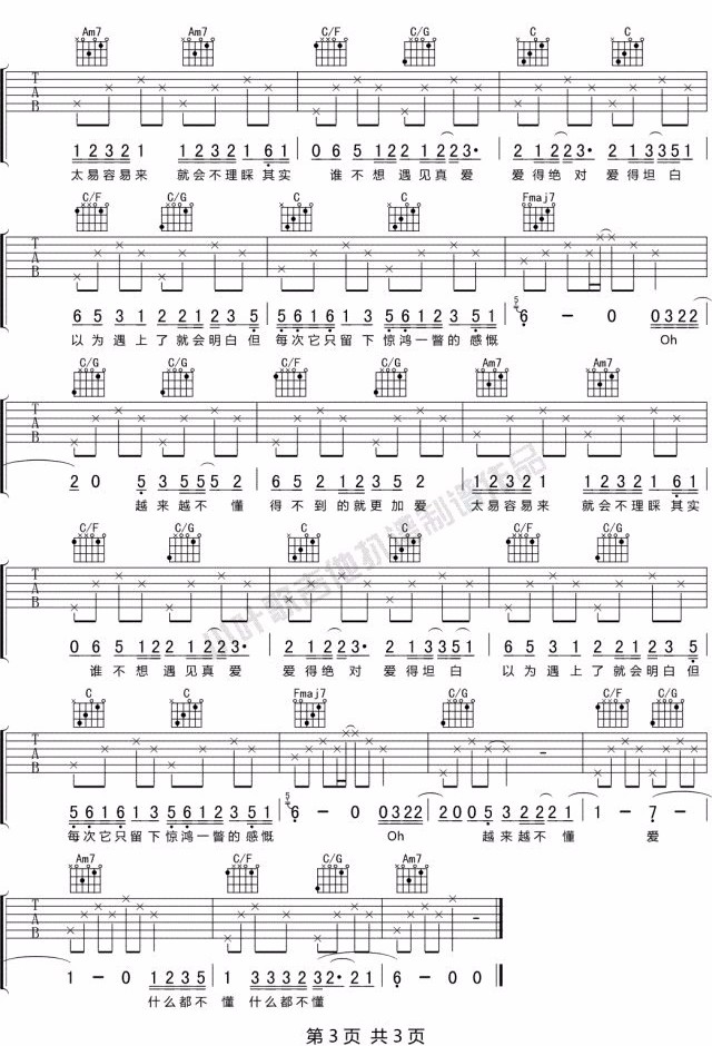 曲谱介绍: 沈以诚《越来越不懂》吉他弹唱谱,采用C调指法编配原版,共有3张高清图谱。