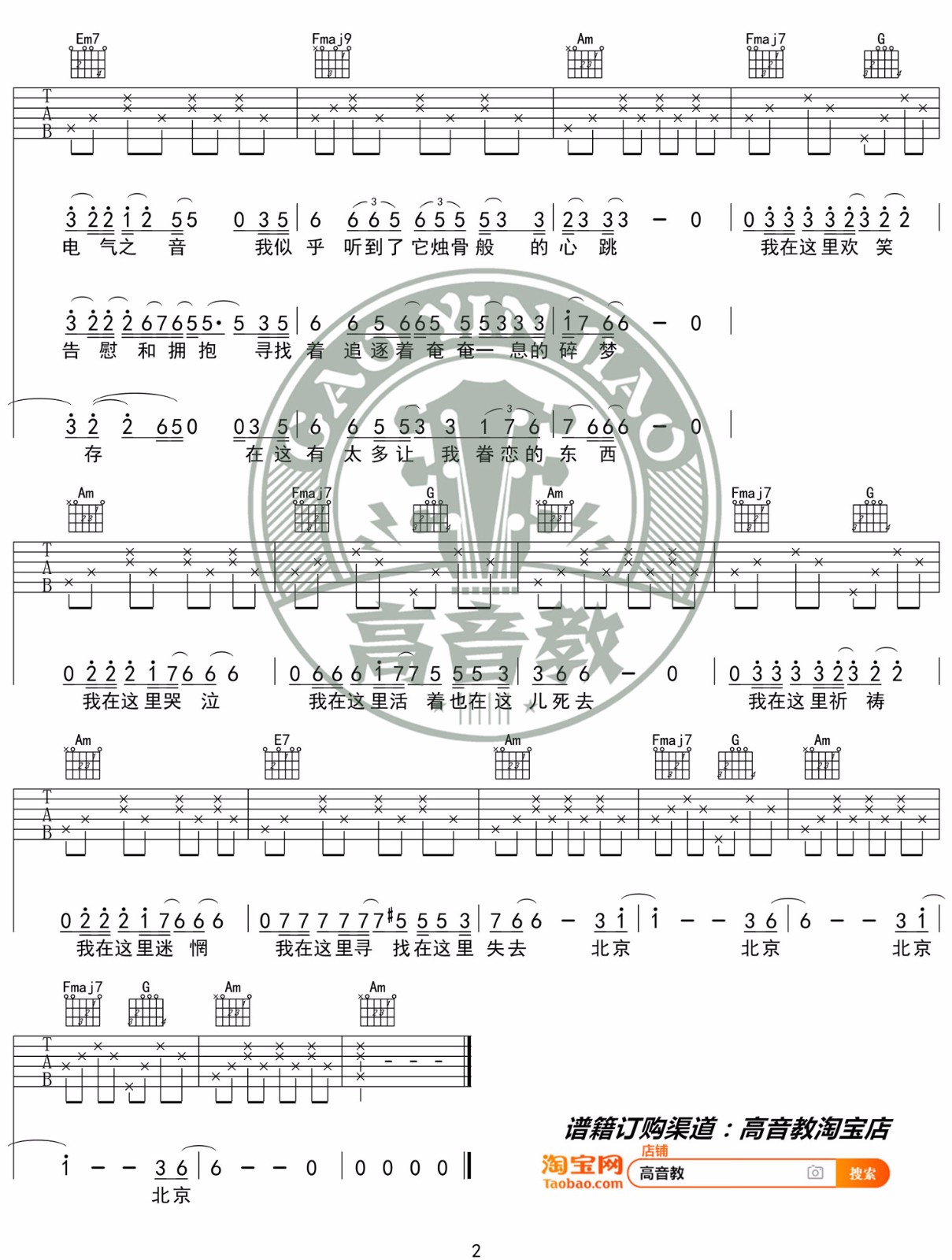 曲谱介绍: 汪峰《北京北京》吉他弹唱谱,采用C调指法编配,共有2张高清图谱,免翻页排版设计。