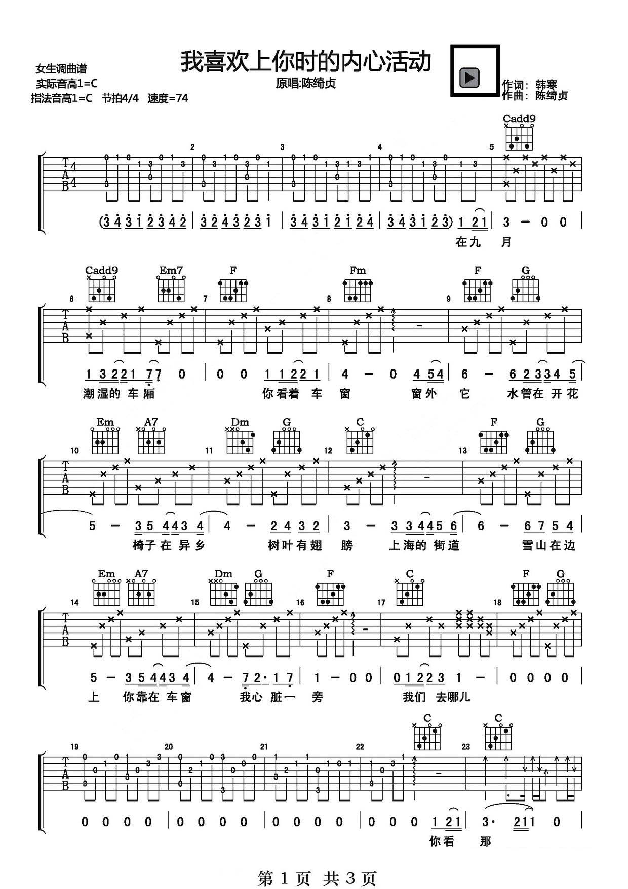 曲谱介绍: 陈绮贞《我喜欢上你时的内心活动》吉他弹唱谱,采用C调指法编配原版,共有3张高清图谱。