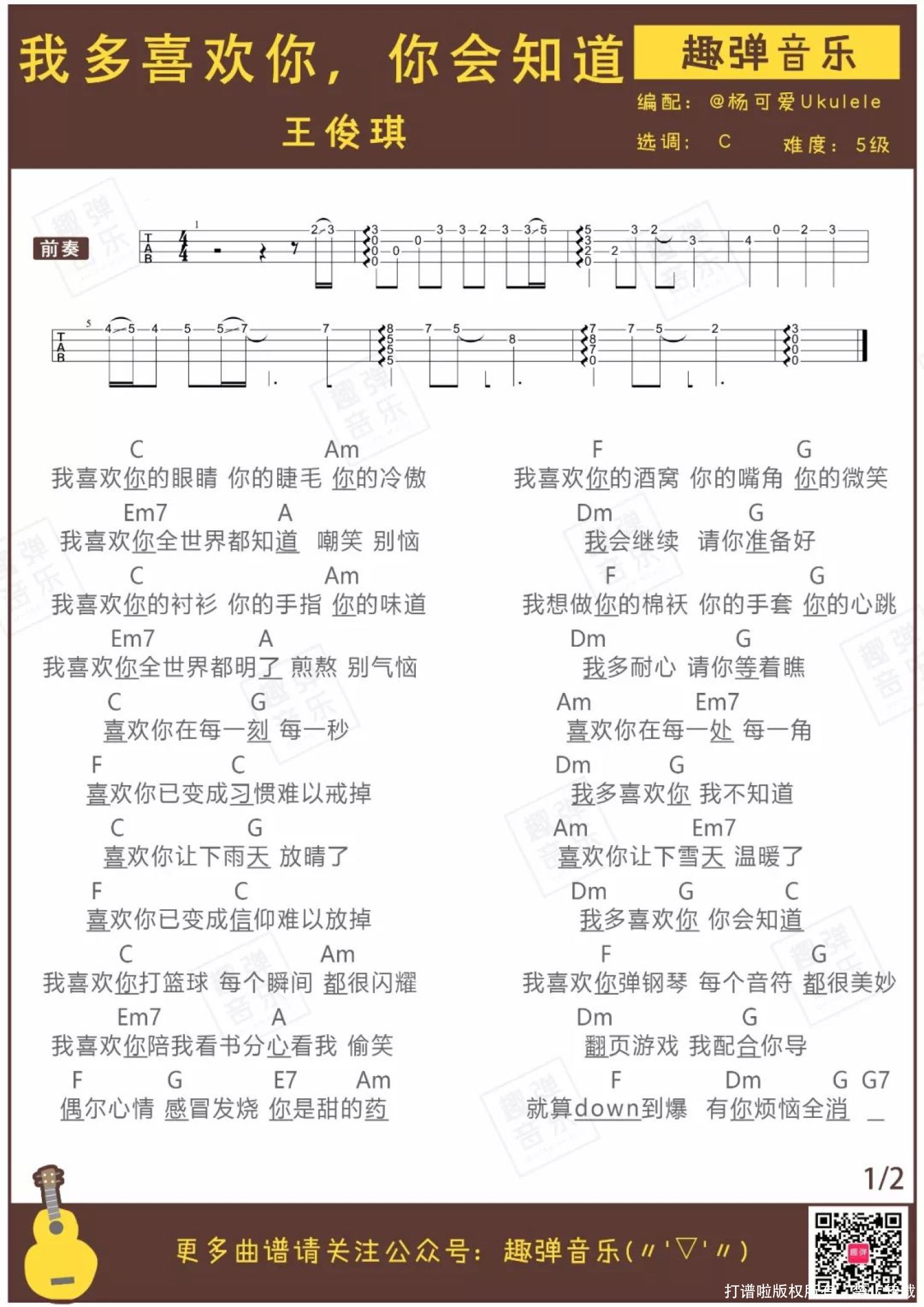 曲谱介绍: 如果我说「致我们单纯的小美好」是2017年最甜的校园网剧之一,应该不会有人反对吧?呆萌可爱的陈小希和高帅学霸江辰,光身高差就能戳中一片少女心。 主题曲「我多喜欢你,你会知道」更是成为少女们挂在嘴边哼唱的表白首选,活泼轻快的旋律搭配又傻又甜的歌词,把单纯直白的喜欢全都唱在了歌里。 当可爱俏皮的尤克里里遇到这首少女心满满的歌,一定会甜到起飞吧♪ 不信你看视频里的小姐姐,是不是周围都冒着粉色泡泡?   弹唱MV   关于这首歌 ● 是网剧「致我们单纯的小美好」推广曲。● 由杨凯伊作词、作曲,王俊琪演唱。 剧中的陈小希是一个不太聪明,但执着得可爱的女孩子。她会对品学+颜值兼优的江辰单纯又直接地说出喜欢,「我多喜欢你,你会知道」简直是她追夫之路的真实写照。 我喜欢你 全世界都知道 我会继续 请你准备好 偷偷暗恋的小哥哥也好,隔着屏幕花痴的明星也好,只要是喜欢的那个人,就会觉得他总是在闪闪发光吧。 想要像陈小希那样,坦率又可爱地把心里的喜欢都唱出来吗?那就收谱一起弹唱这首少女心满满的歌儿吧♪   弹唱曲谱