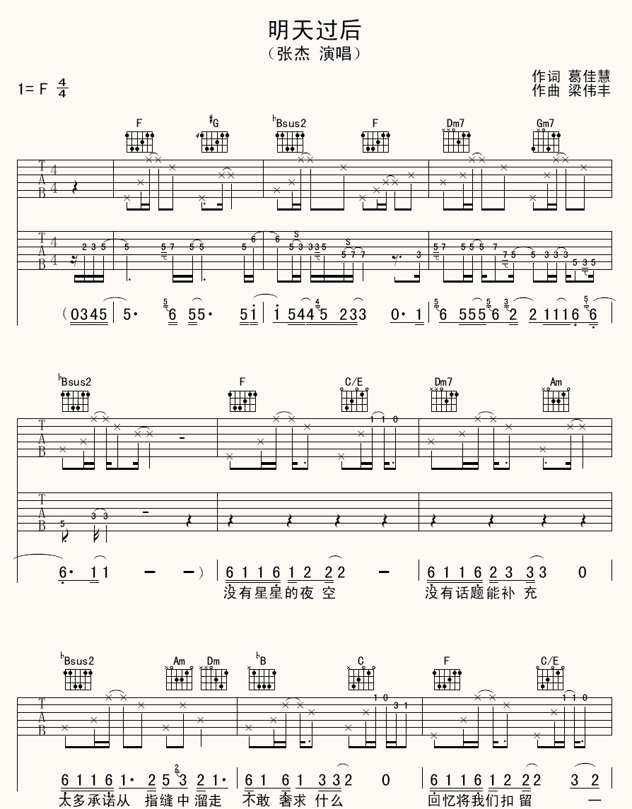 明天过后吉他谱 - 张杰 - F调吉他弹唱谱 - 原版