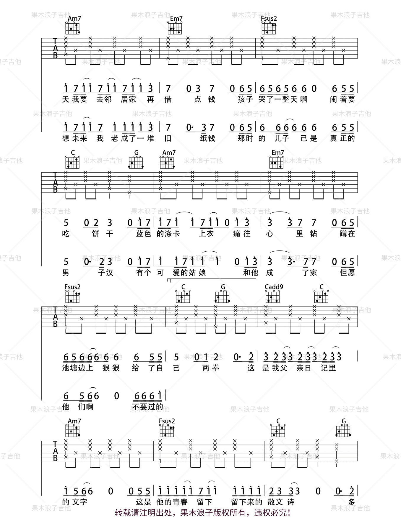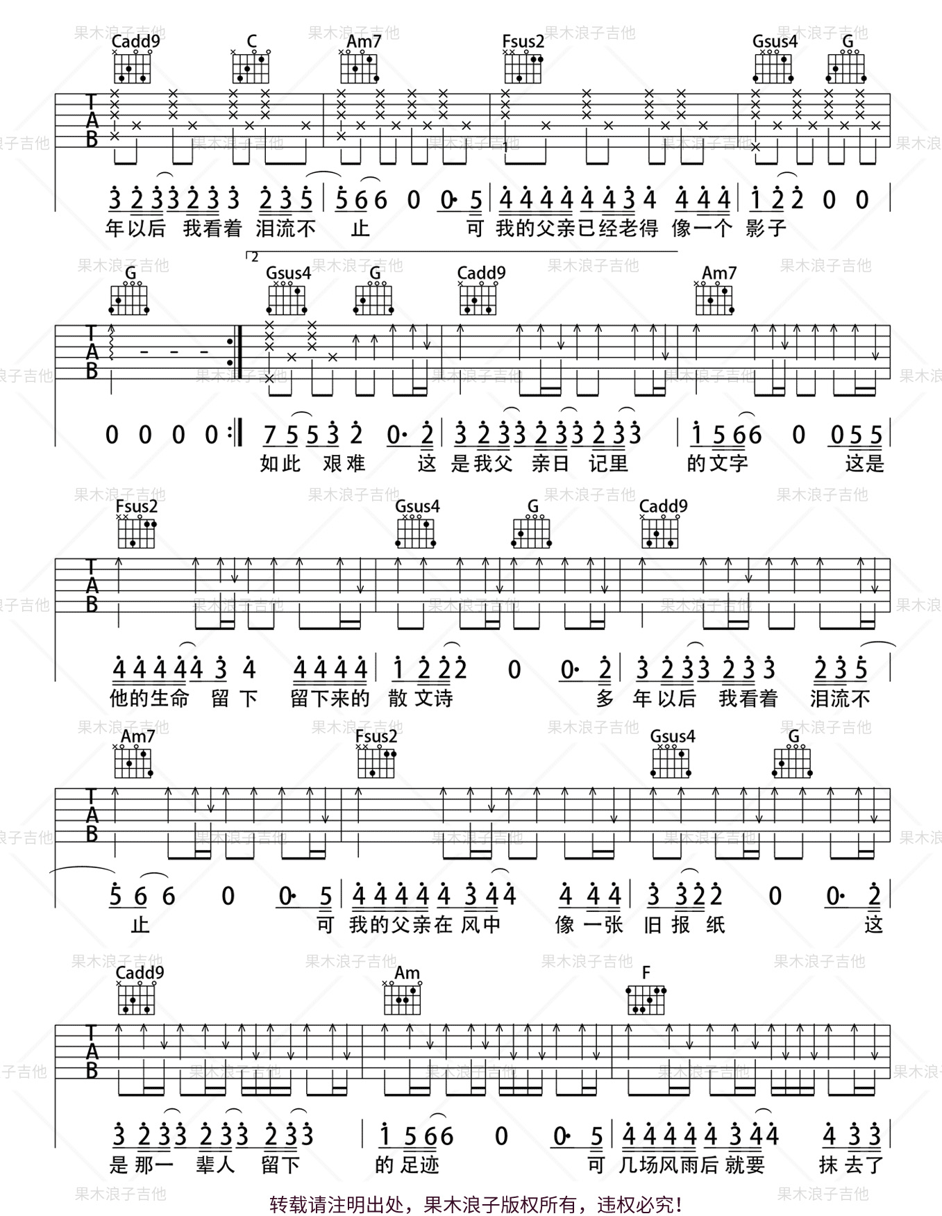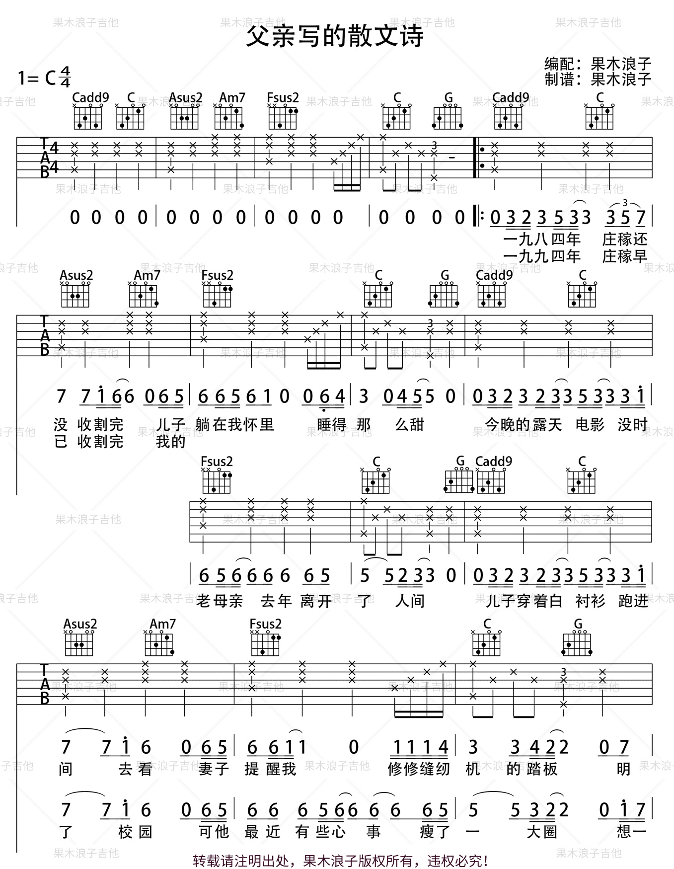 曲谱介绍: 李健《父亲写的散文诗》吉他弹唱谱,采用C调指法编配原版,共有4张高清图谱。