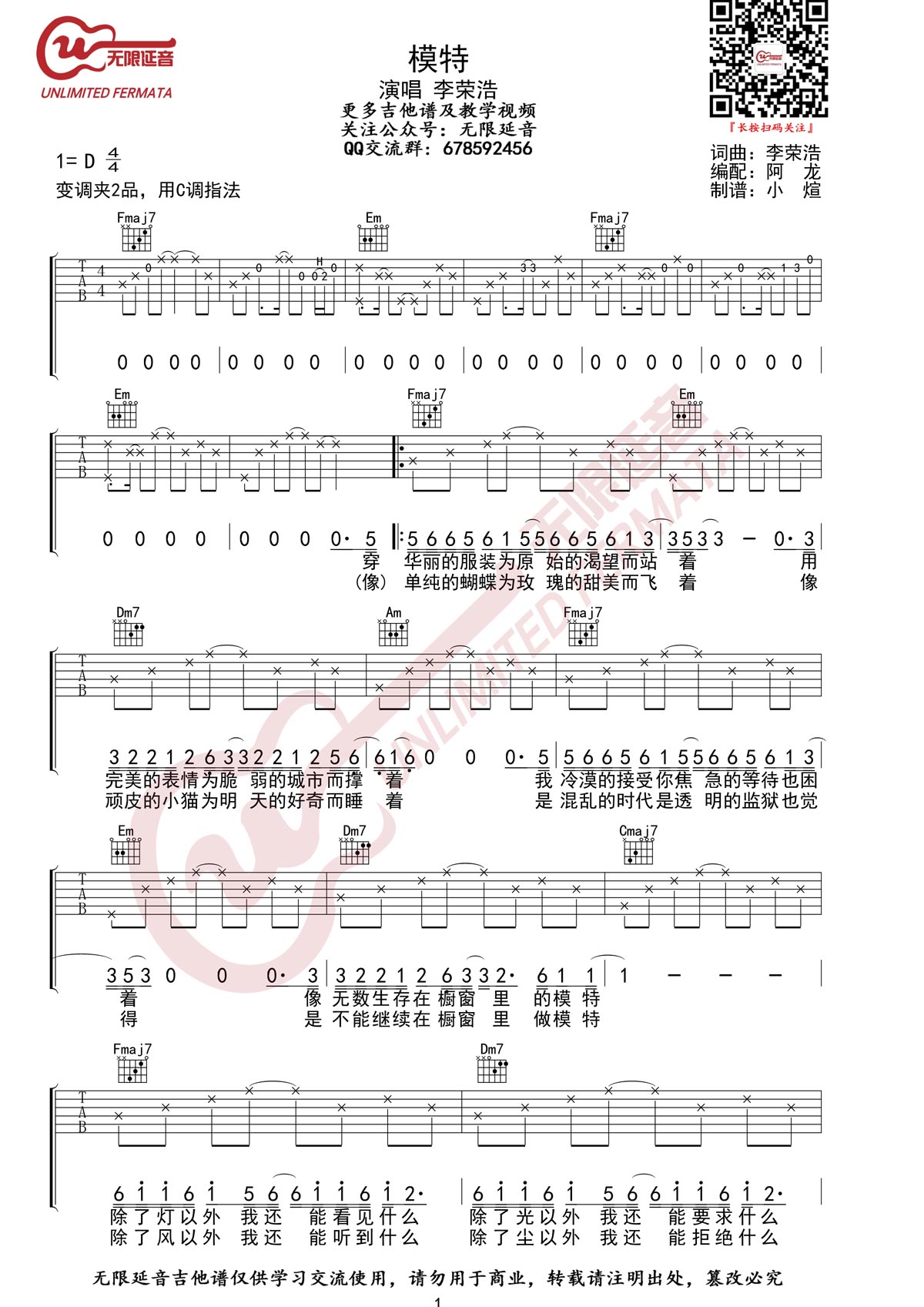 模特吉他谱 - 李荣浩 - C调吉他弹唱谱 - 原版