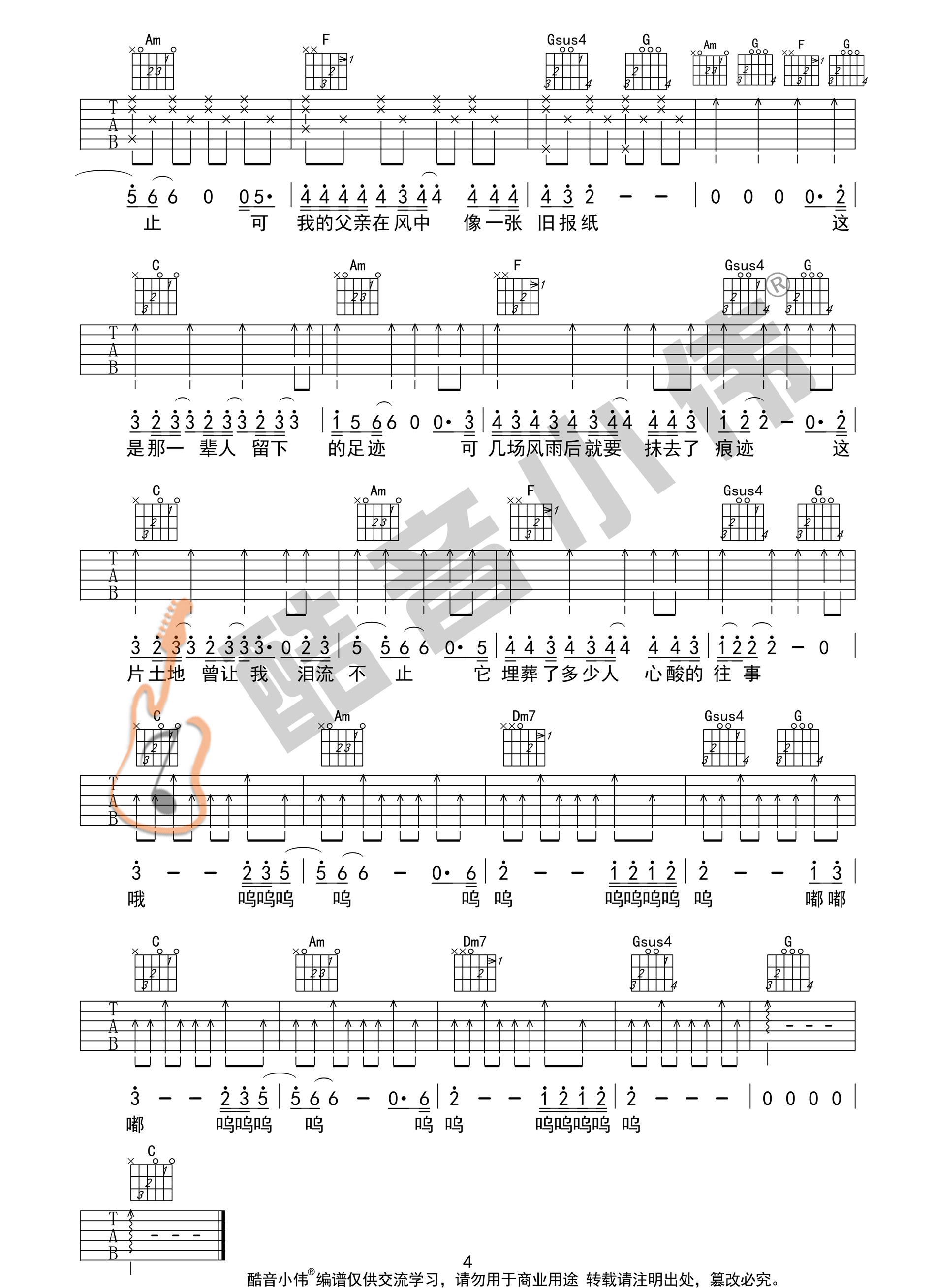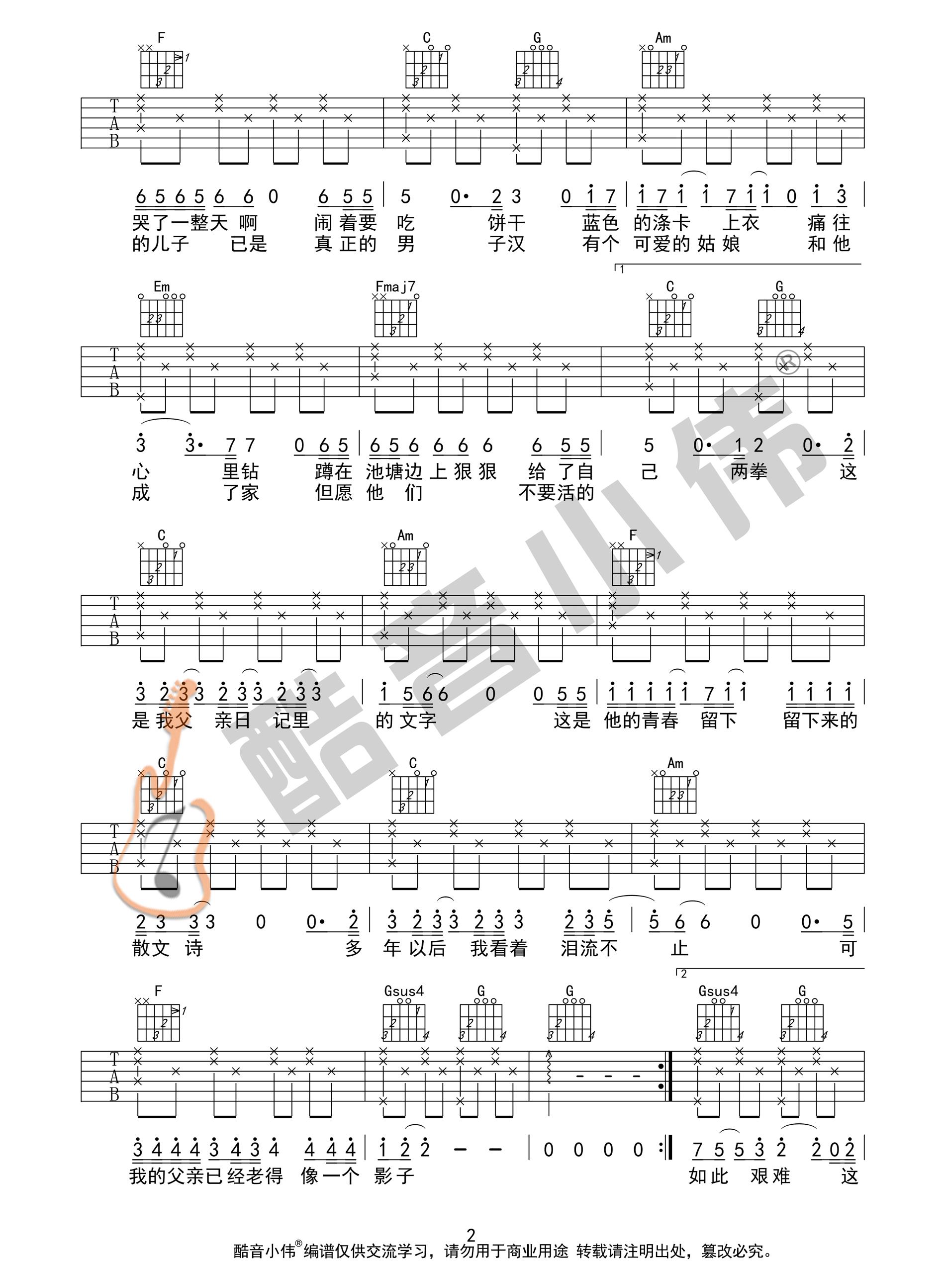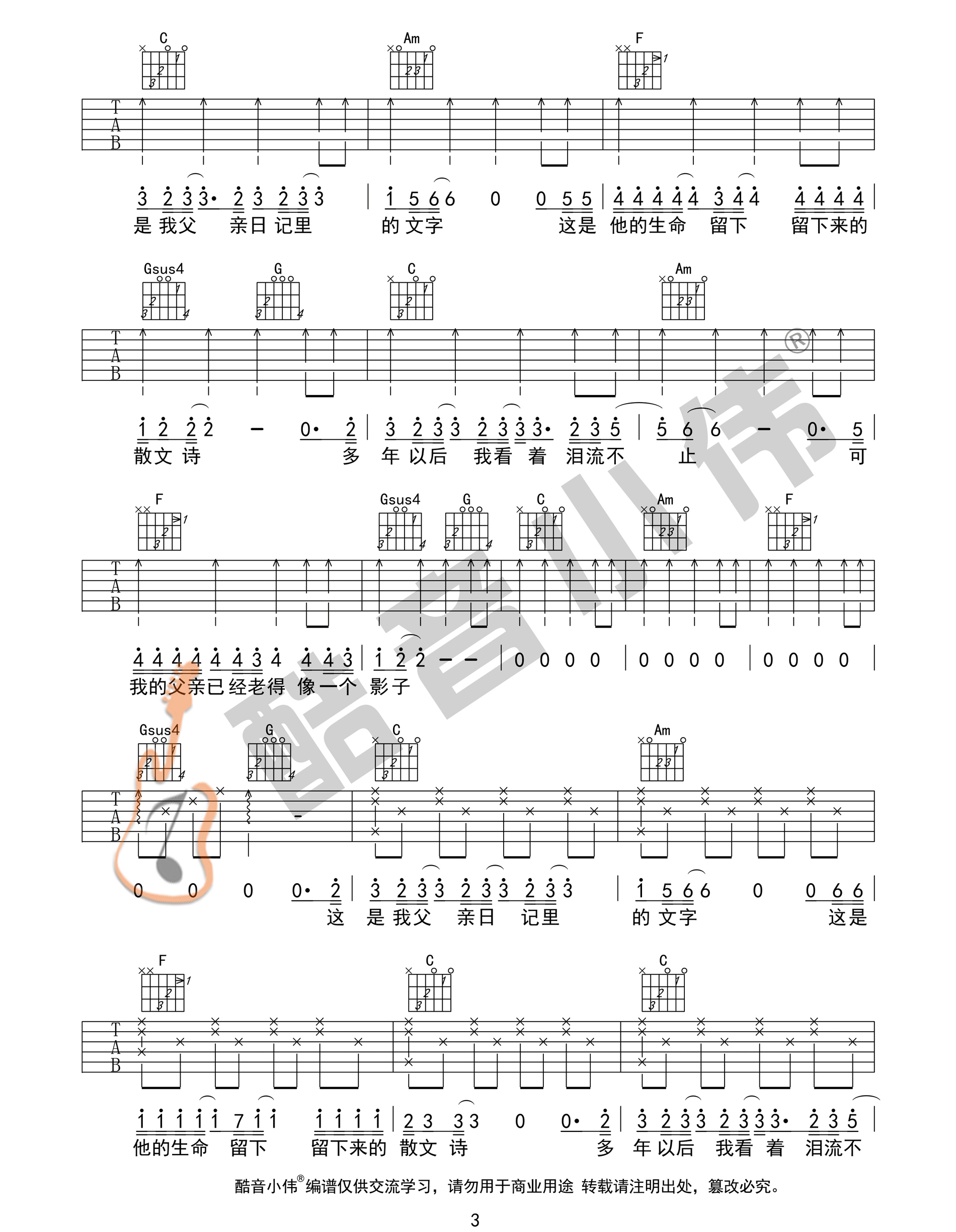曲谱介绍: 许飞《父亲的写散文诗》吉他弹唱谱,采用C调指法编配,共有4张高清图谱。