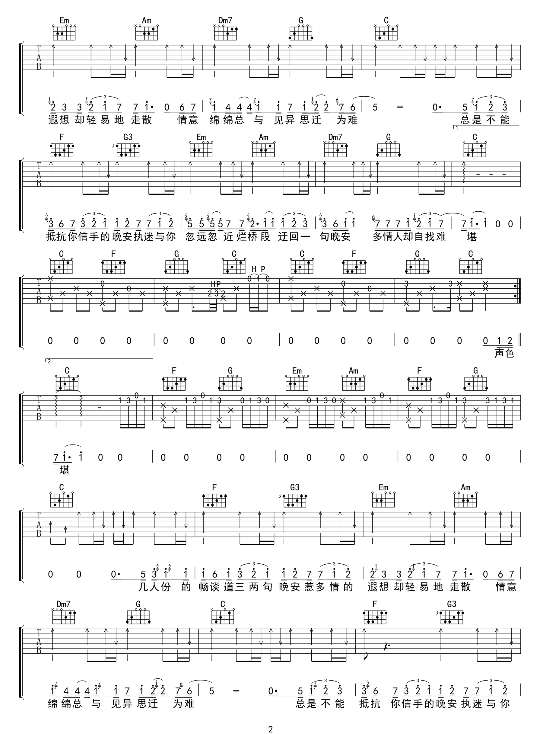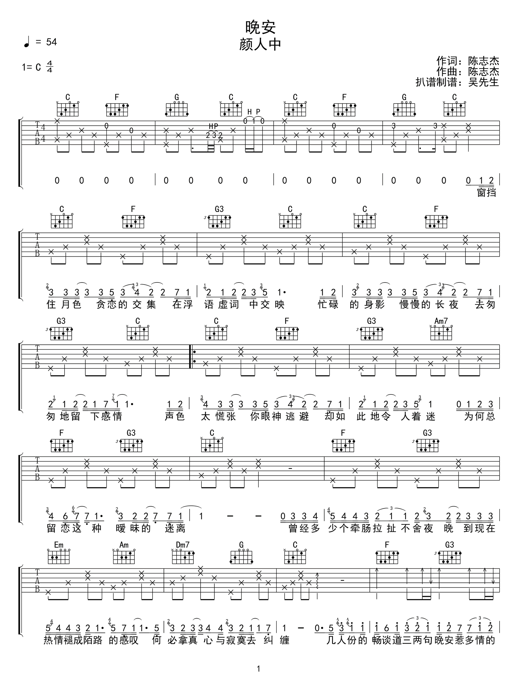 曲谱介绍: 颜人中《晚安》吉他弹唱谱,采用C调指法编配原版,共有3张高清图谱。