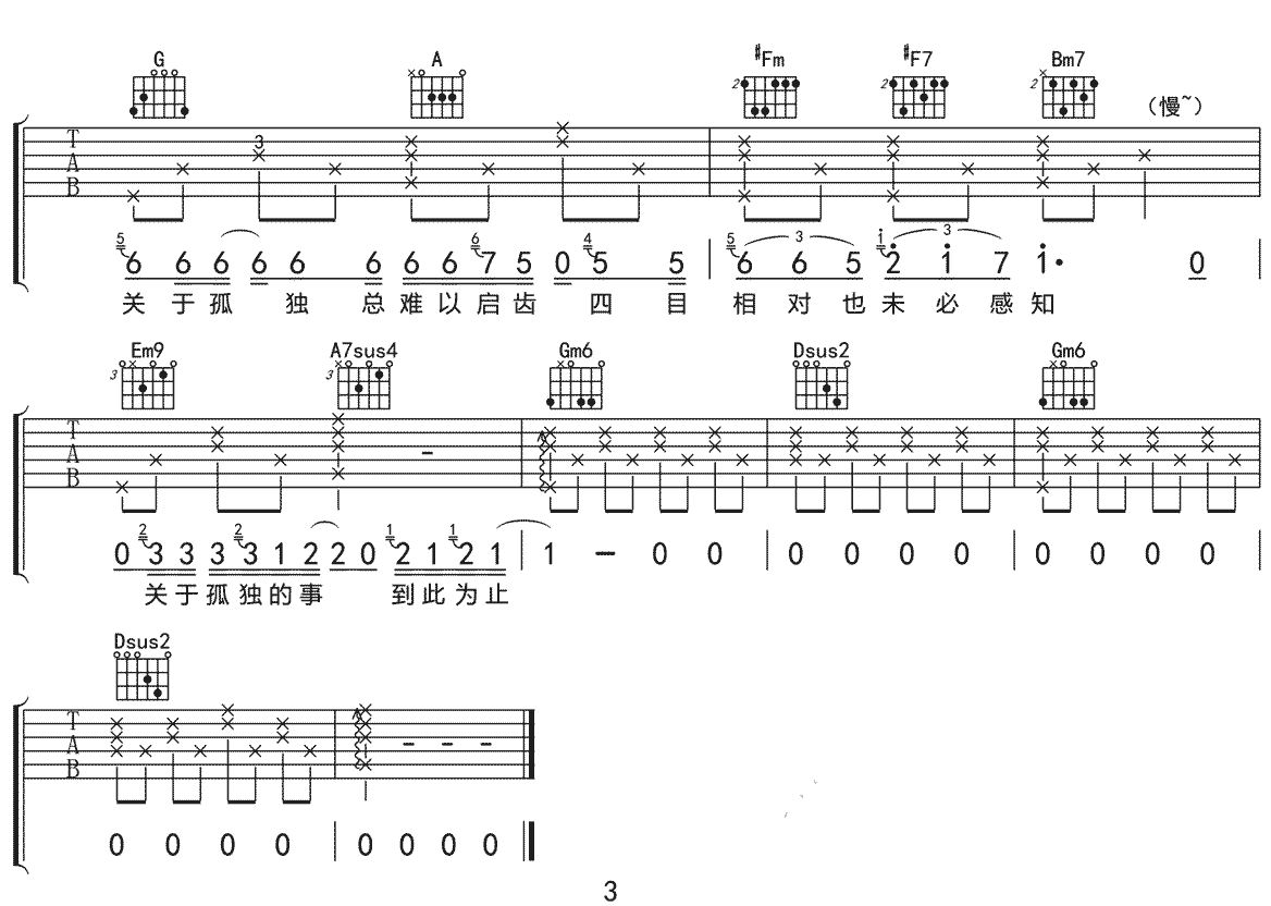 曲谱介绍: 马良《事关孤独》吉他弹唱谱,采用D调指法编配原版,共有3张高清图谱。