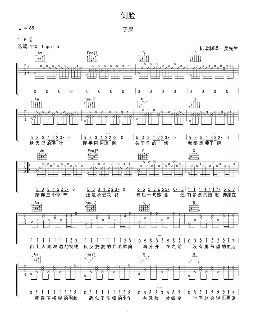 曲谱介绍: 于果《侧脸》吉他弹唱谱,采用C调指法编配原版,共有2张高清图谱,免翻页排版设计。