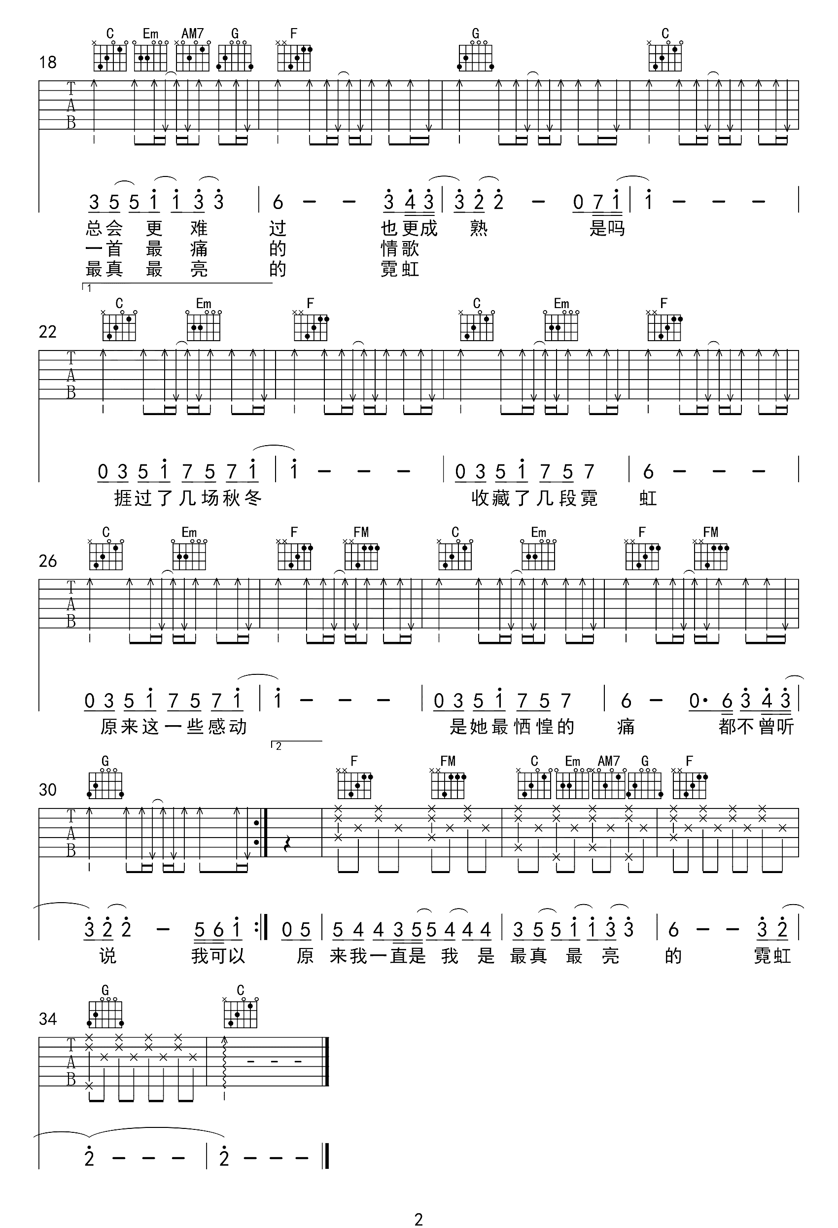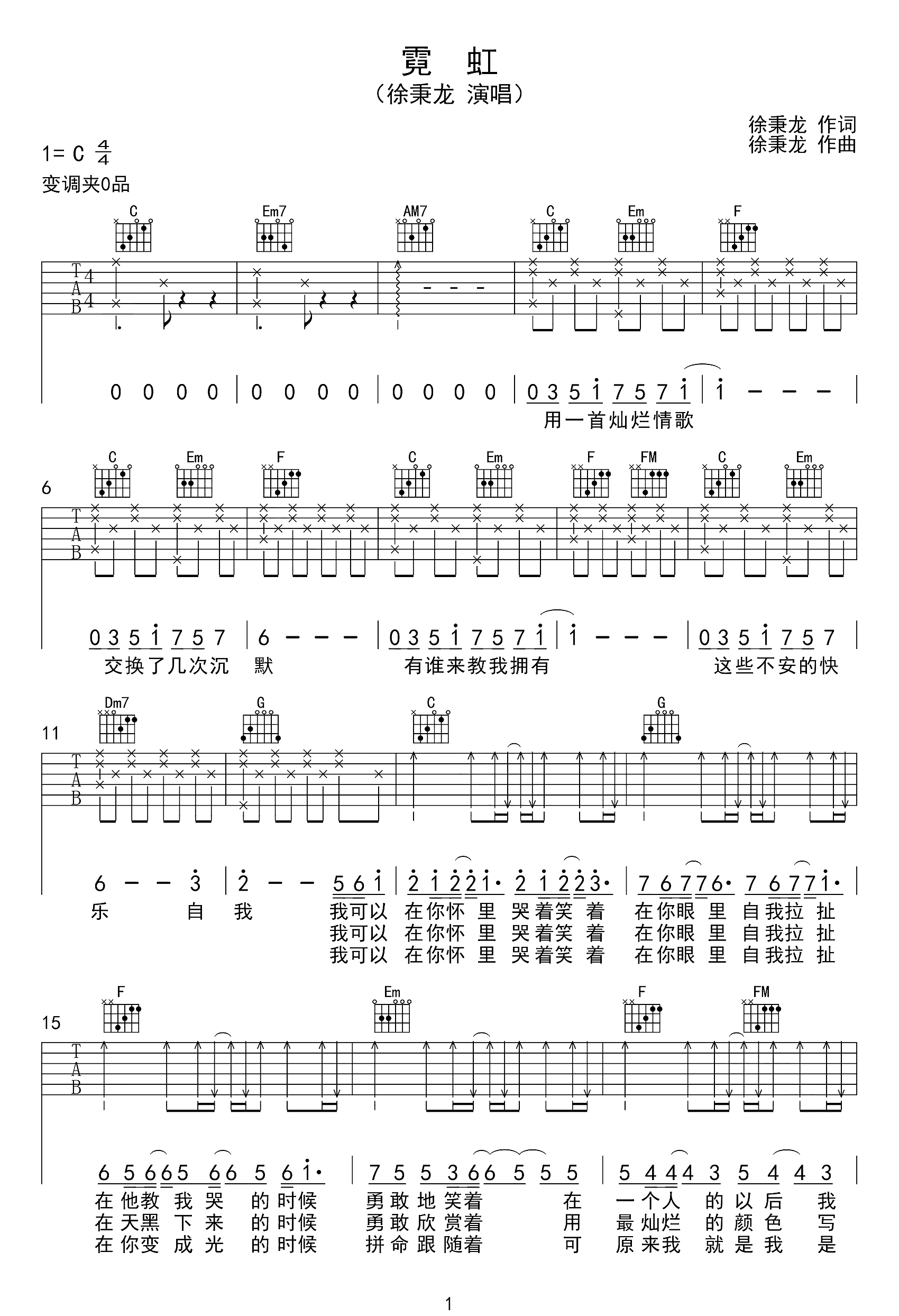 曲谱介绍: 徐秉龙《霓虹》吉他弹唱谱,采用C调指法编配原版,共有2张高清图谱,免翻页排版设计。