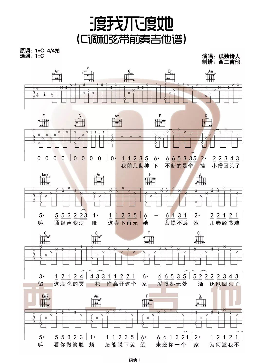 曲谱介绍: 孤独诗人《渡我不渡她》吉他弹唱谱,采用C调指法编配,共有2张高清图谱,免翻页排版设计。