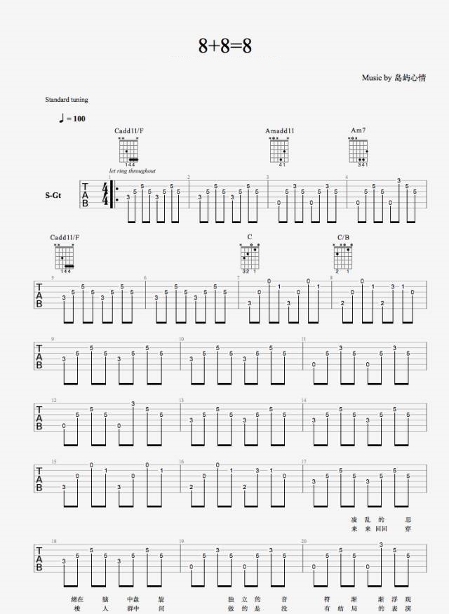 曲谱介绍: 岛屿心情《8+8=8》吉他弹唱谱,采用C调指法编配原版,共有3张高清图谱。