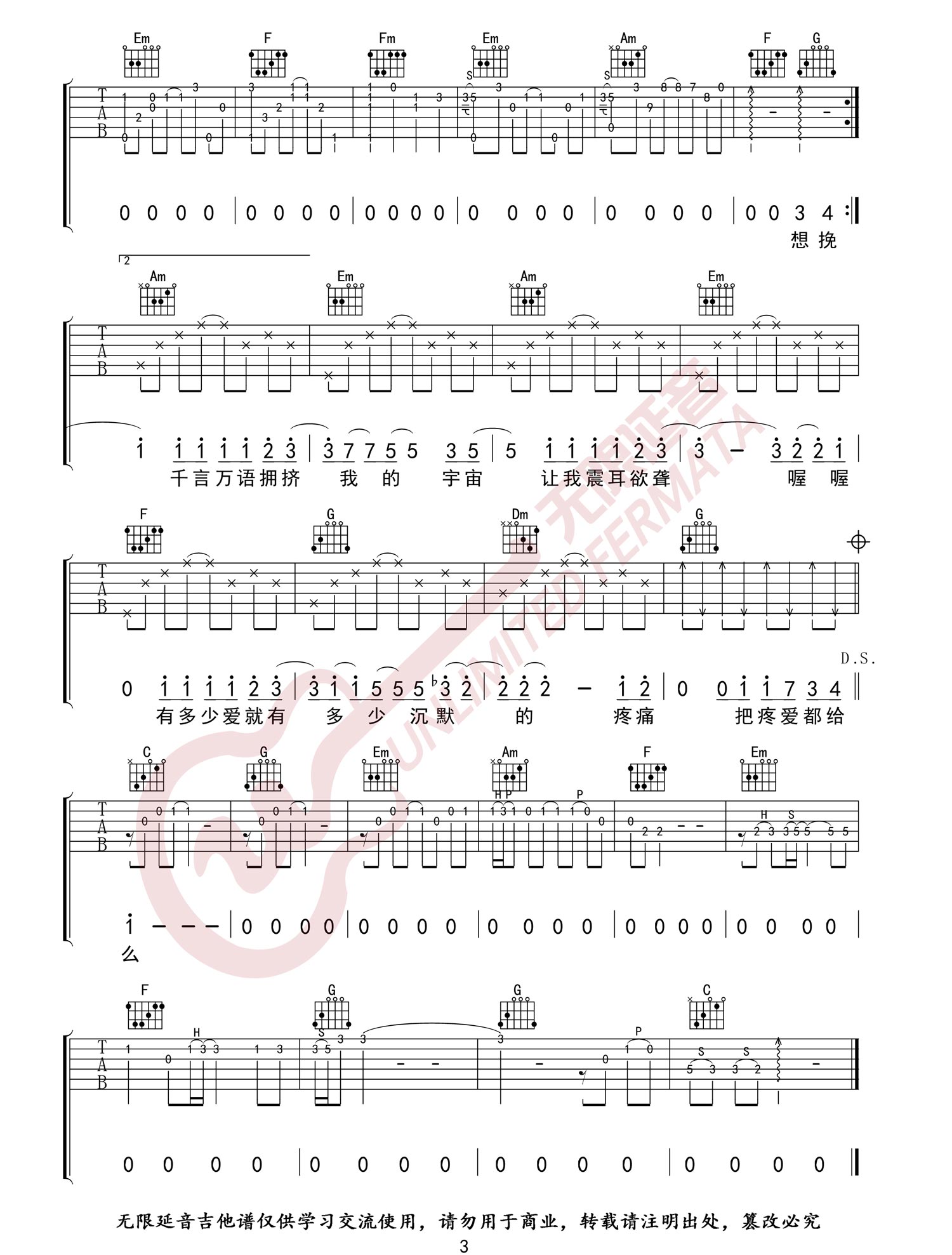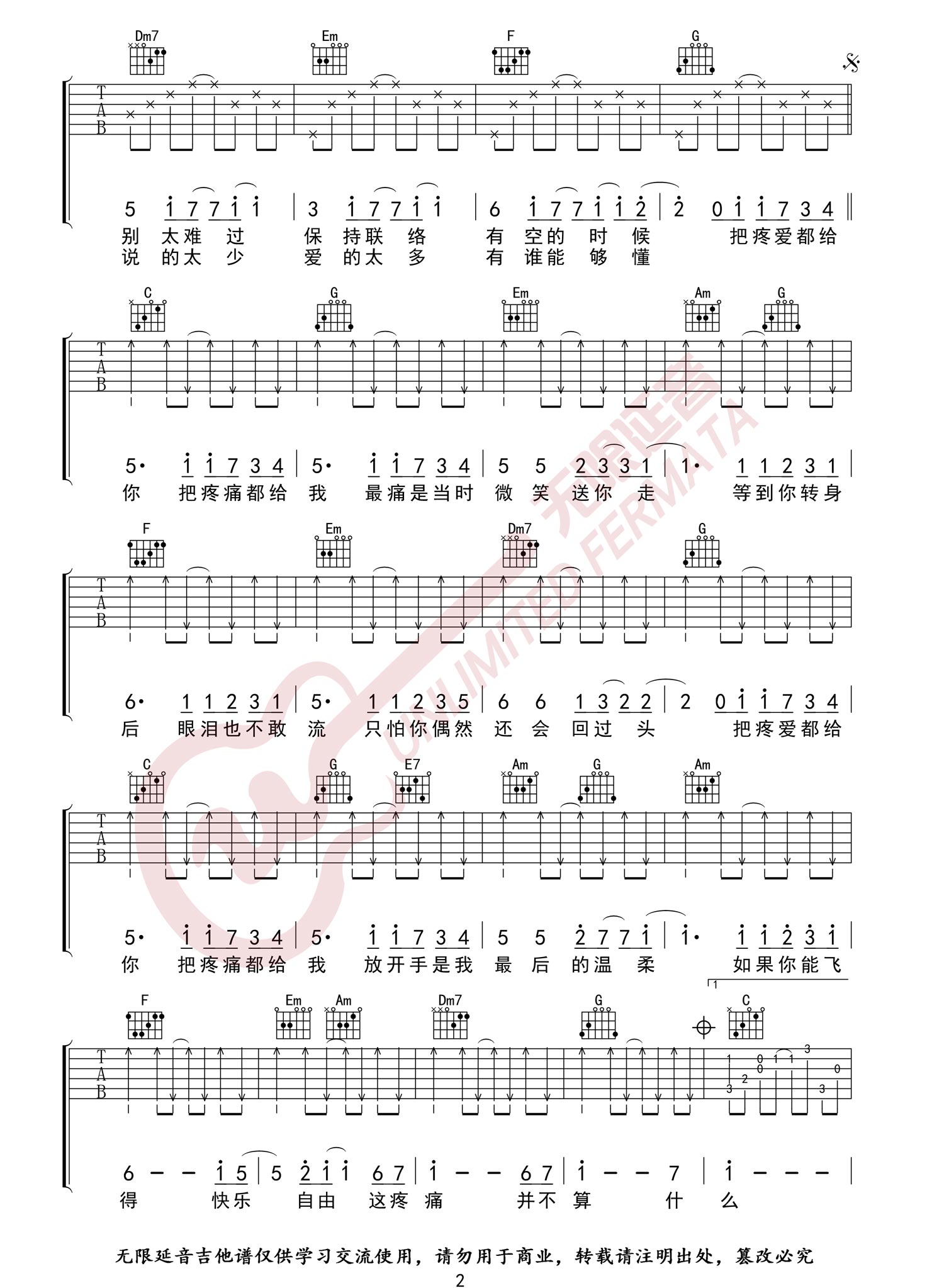 曲谱介绍: 萧敬腾《疼爱》吉他弹唱谱,采用C调指法编配原版,共有3张高清图谱。