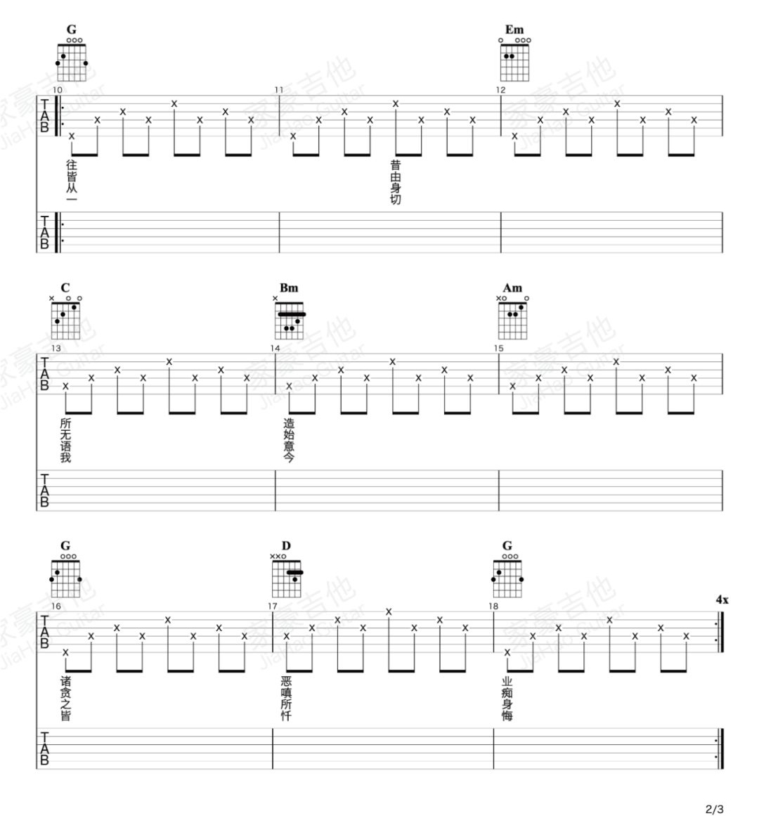 曲谱介绍: 夏小虎《忏悔文》吉他弹唱谱,采用G调指法编配,共有3张高清图谱。