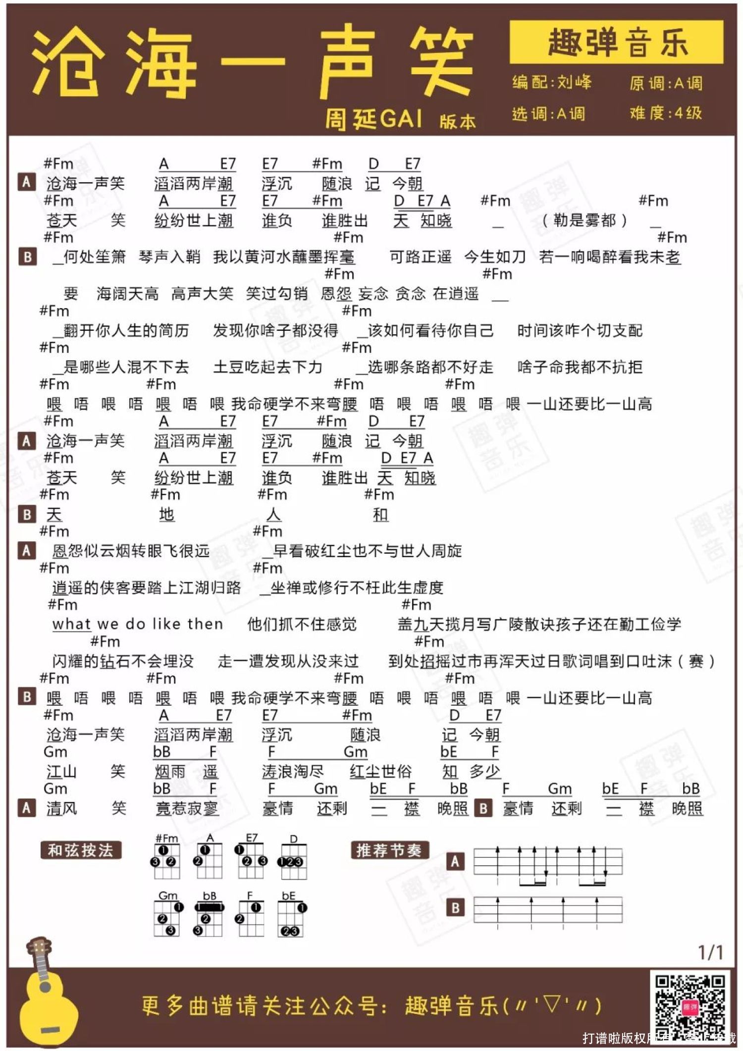 曲谱介绍: 《沧海一声笑》尤克里里弹唱谱 全场气氛最燃瞬间出现在嘻哈歌手GAI的演唱中。一首改编的《沧海一声笑》不失潇洒豪情,又多了几分桀骜不驯。 经典与流行的碰撞在怀旧之余又带来新的活力,让人对说唱音乐有了全新的感受。台上一身江湖侠气,台下却谦虚羞涩的反差萌让GAI一下子圈了不少粉。
