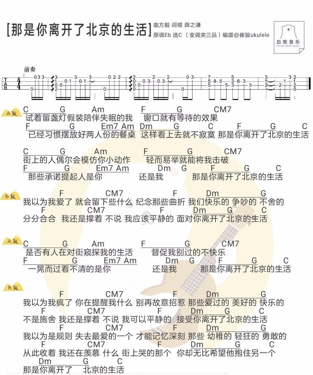曲谱介绍: 薛之谦《那是你离开了北京的生活》吉他弹唱谱,采用C调指法编配,共有1张高清图谱,免翻页排版设计。