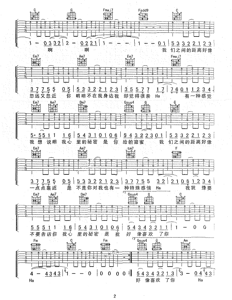 曲谱介绍: 邓紫棋《我的秘密》吉他弹唱谱,采用C调指法编配原版,共有3张高清图谱。