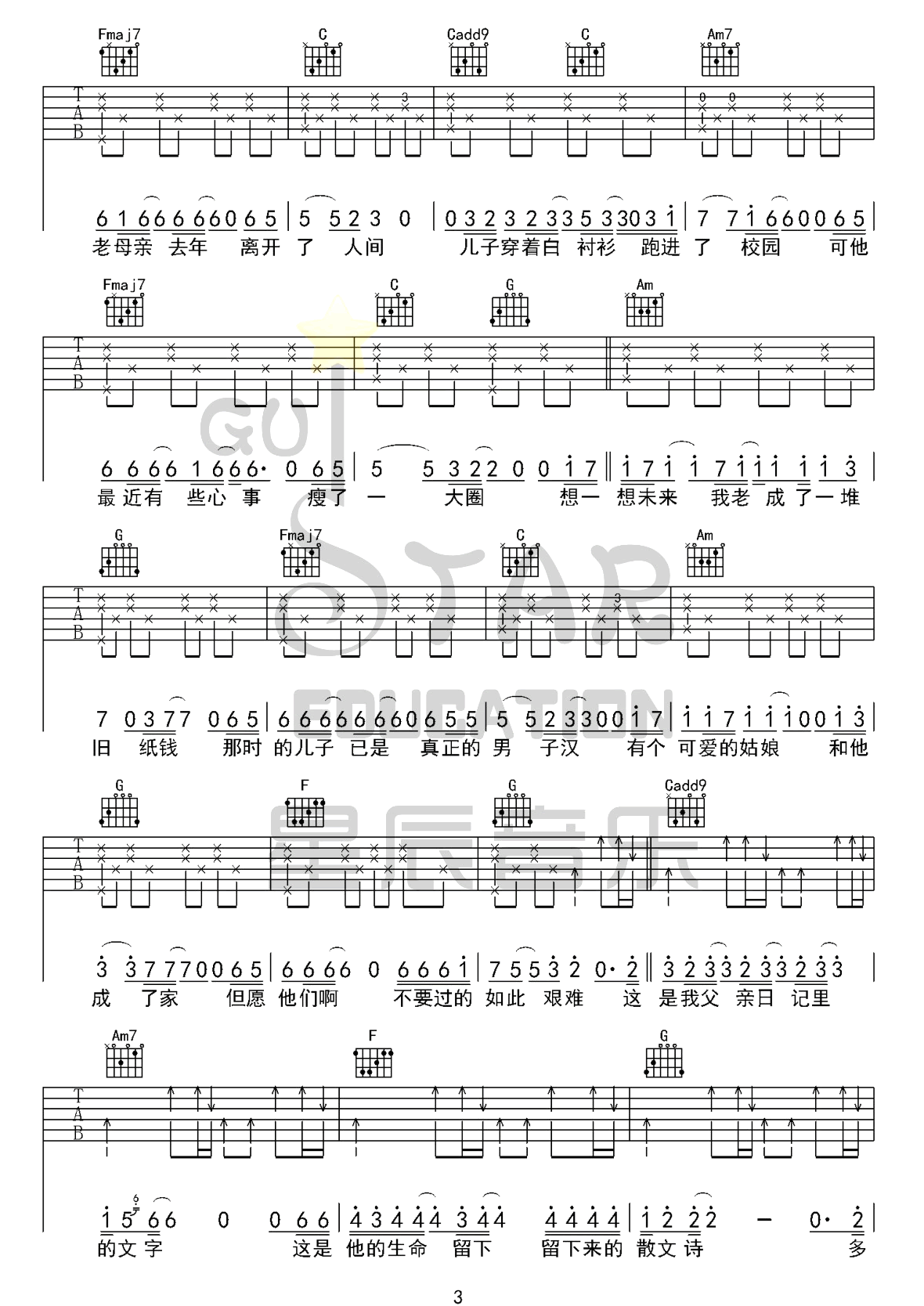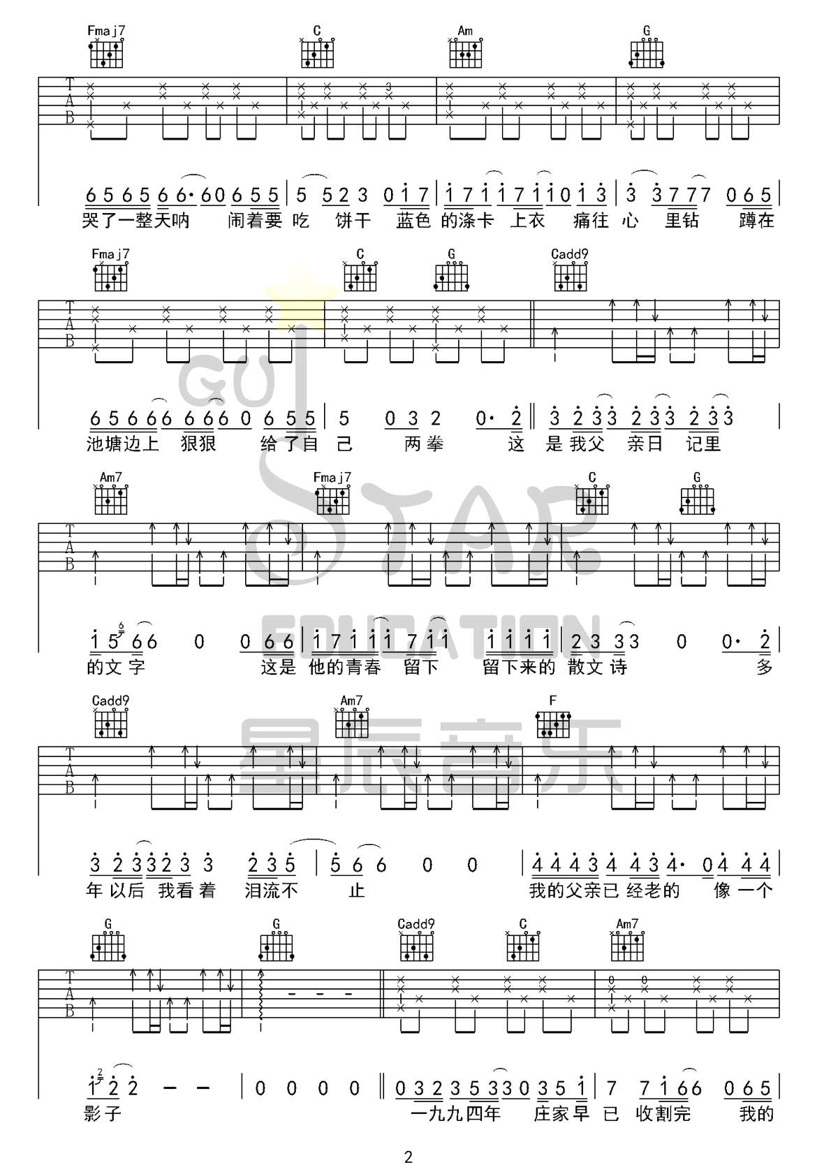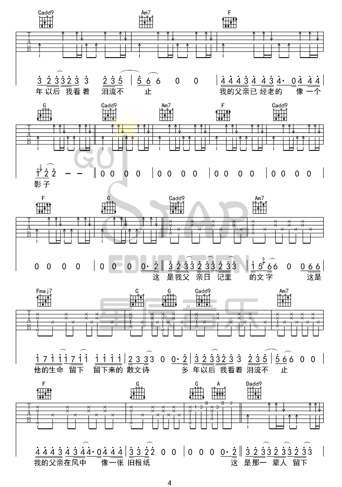 曲谱介绍: 李健/许飞《父亲写的散文诗》吉他弹唱谱,采用C调指法编配原版,共有5张高清图谱。