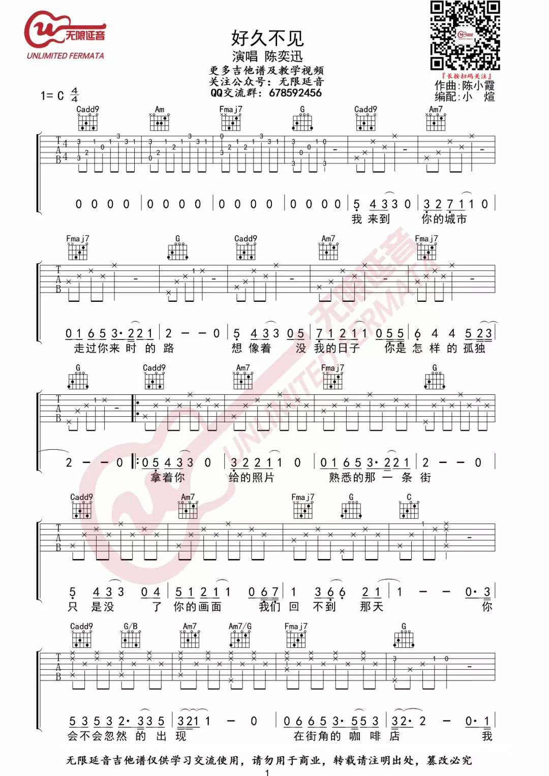 曲谱介绍: 陈奕迅《好久不见》吉他弹唱谱,采用C调指法编配,共有2张高清图谱,免翻页排版设计。