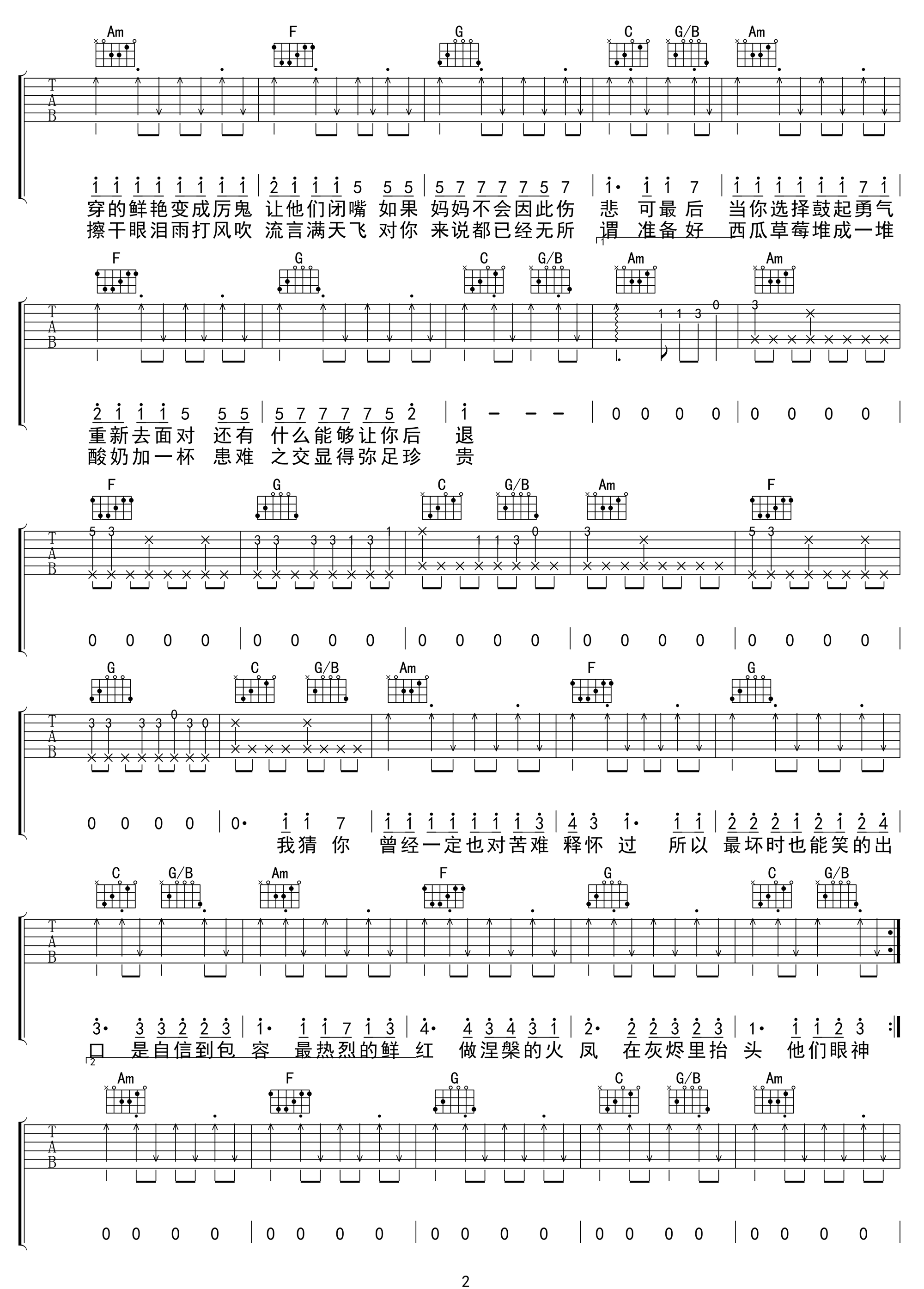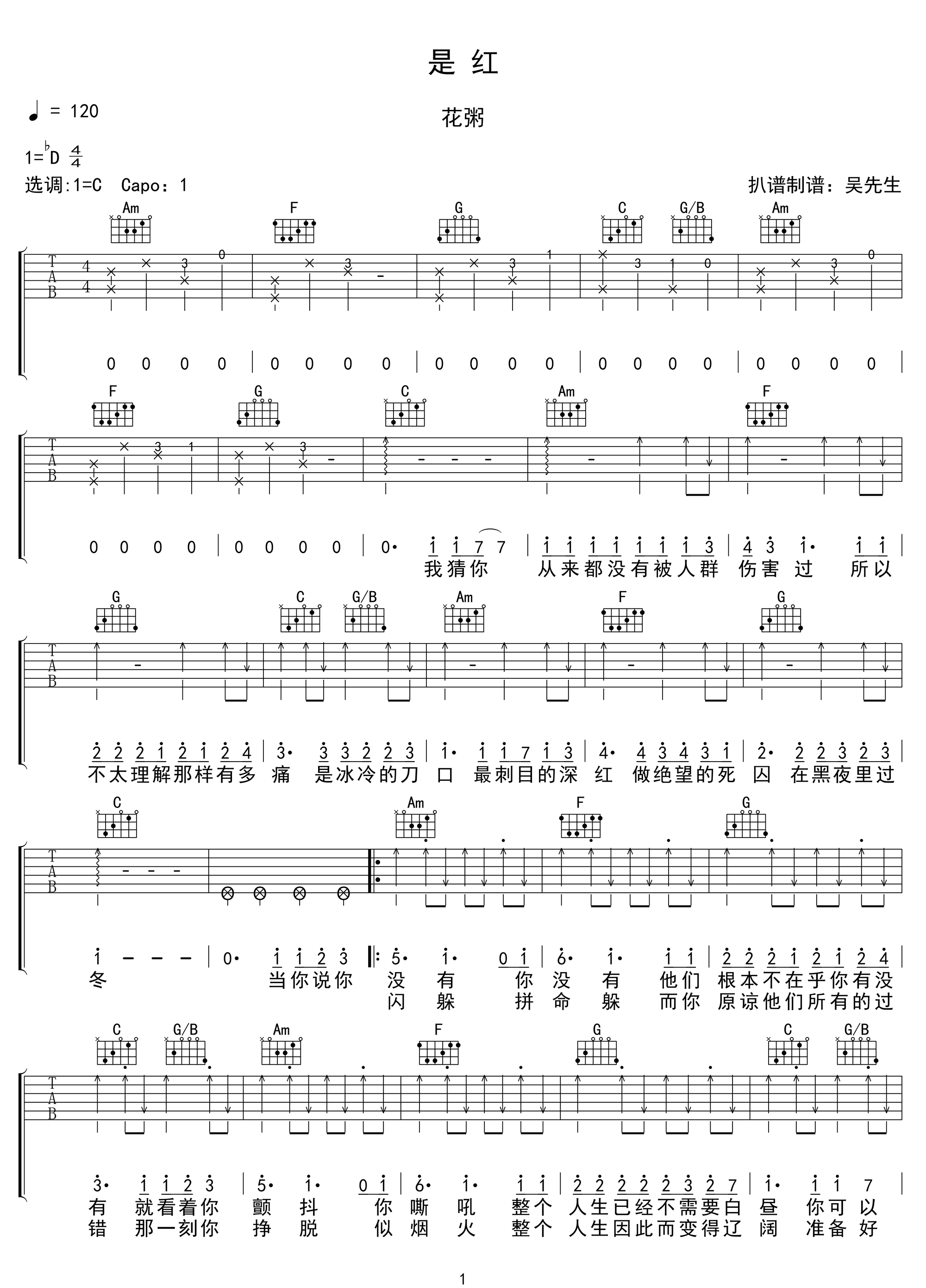 曲谱介绍: 花粥《是红》吉他弹唱谱,采用C调指法编配原版,共有3张高清图谱。