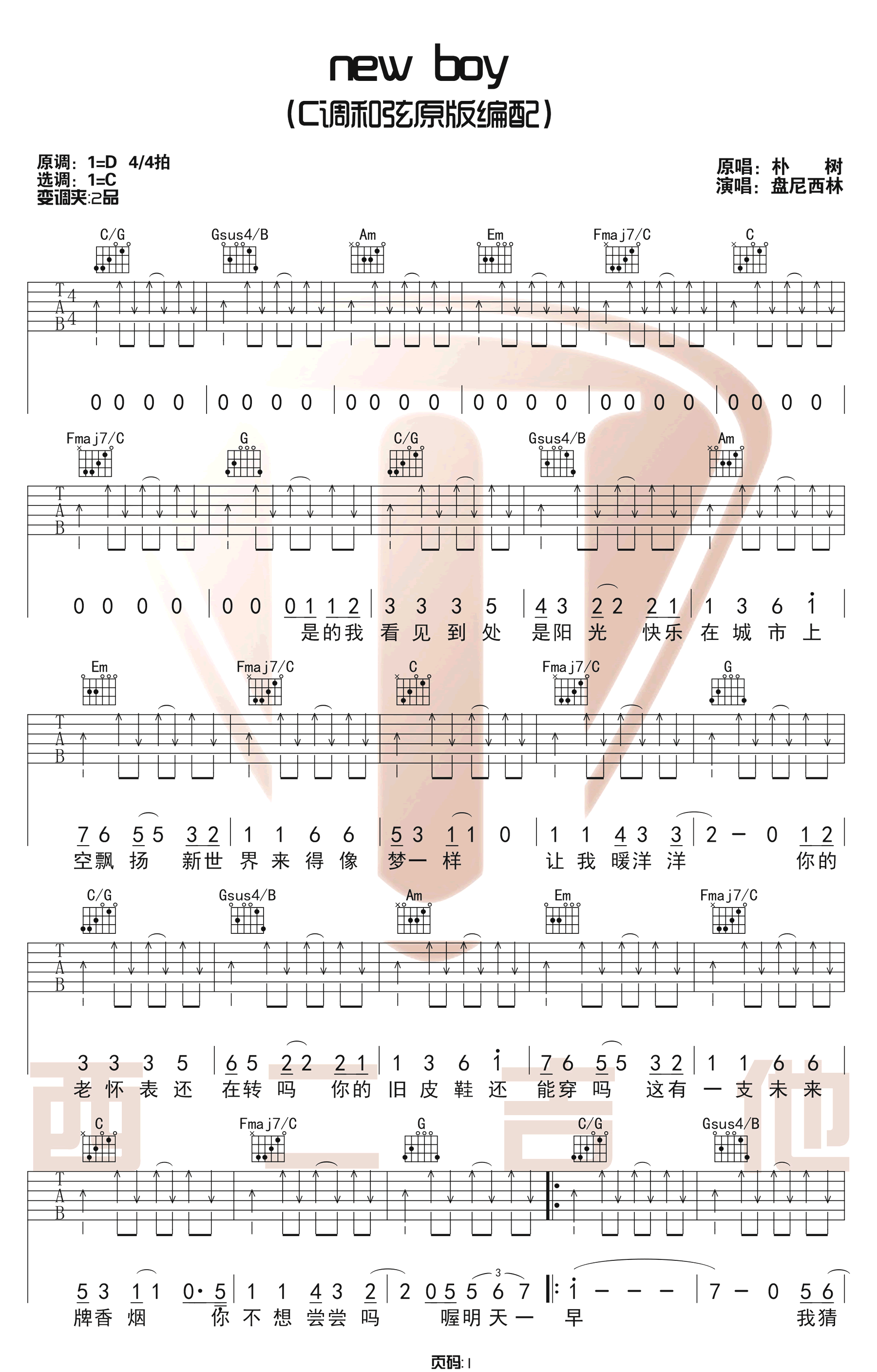 曲谱介绍: 盘尼西林《NewBoy》吉他弹唱谱,采用C调指法编配原版,共有3张高清图谱。