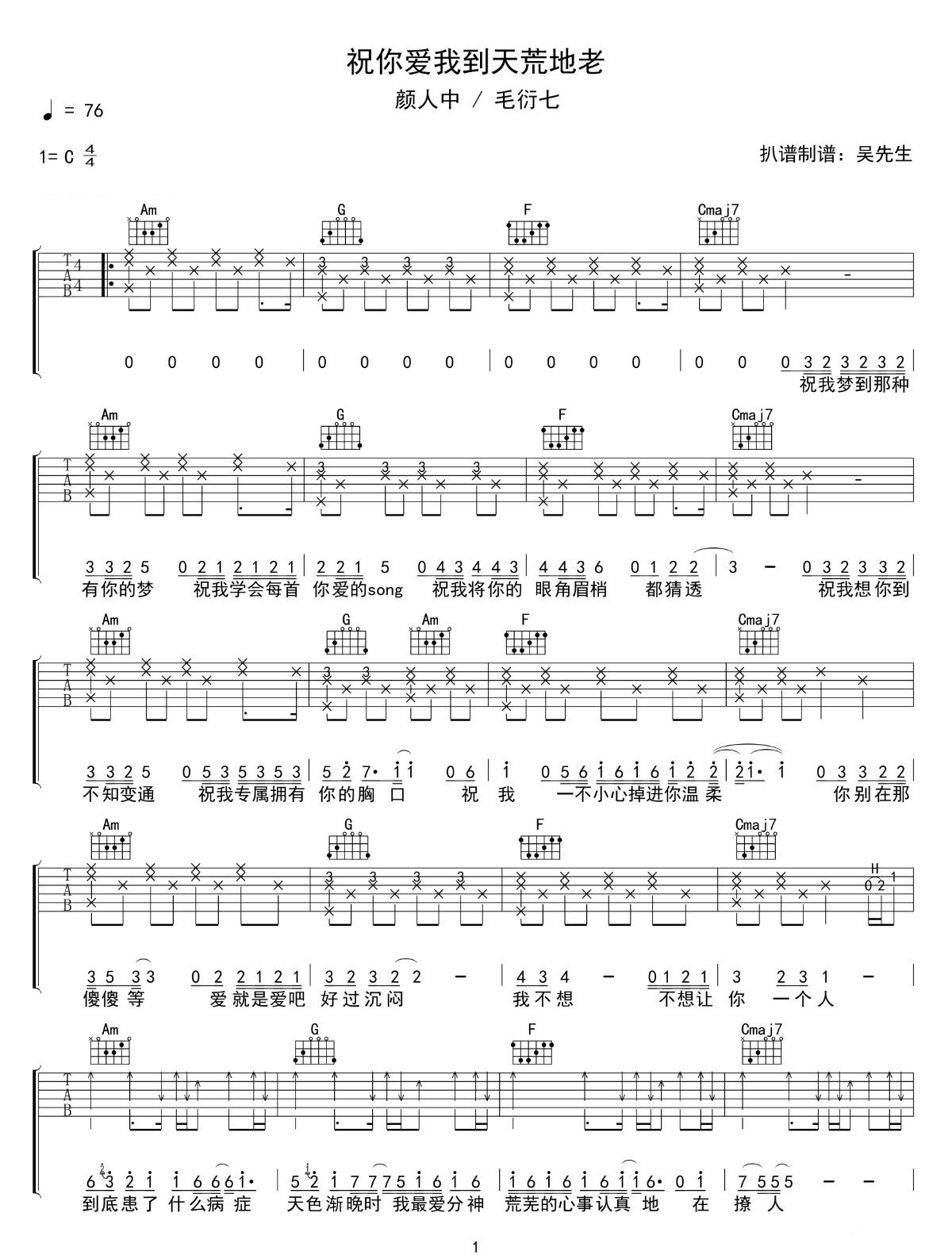 祝你爱我到天荒地老吉他谱 - 颜人中/毛衍七Vava - C调吉他弹唱谱 - 原版