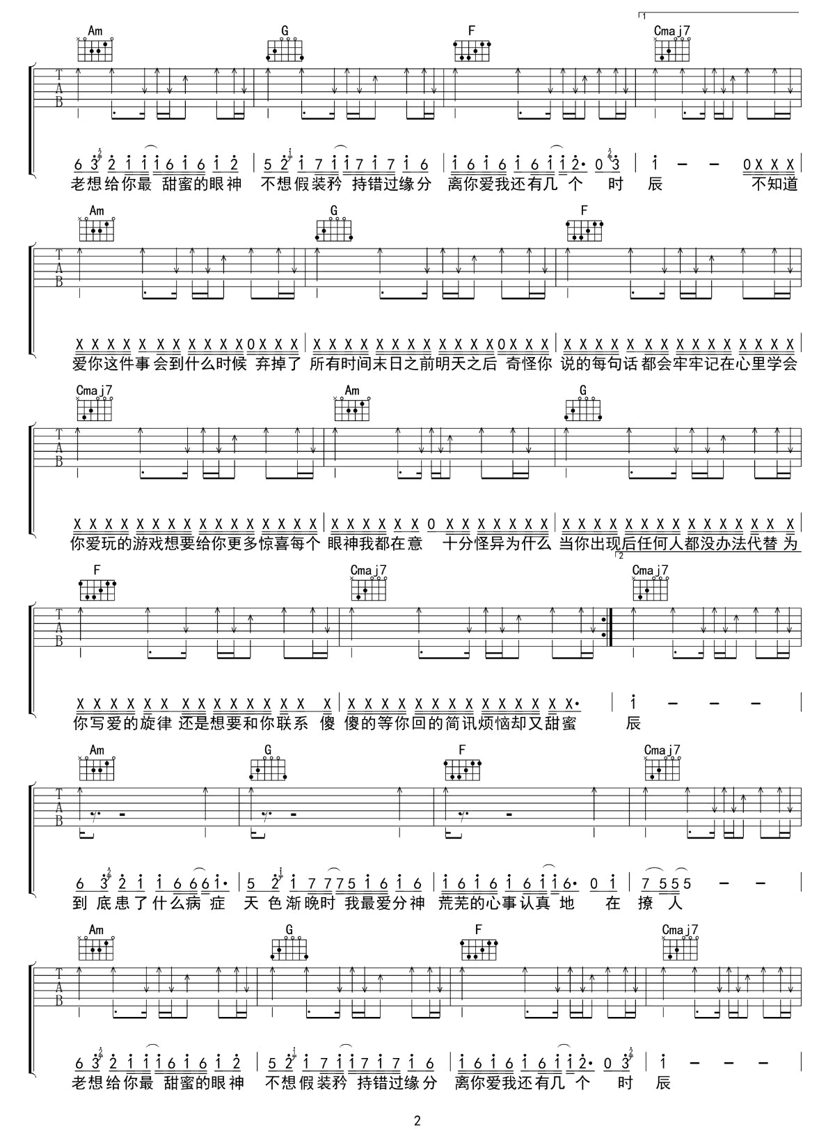 曲谱介绍: 颜人中/毛衍七Vava《祝你爱我到天荒地老》吉他弹唱谱,采用C调指法编配原版,共有3张高清图谱。
