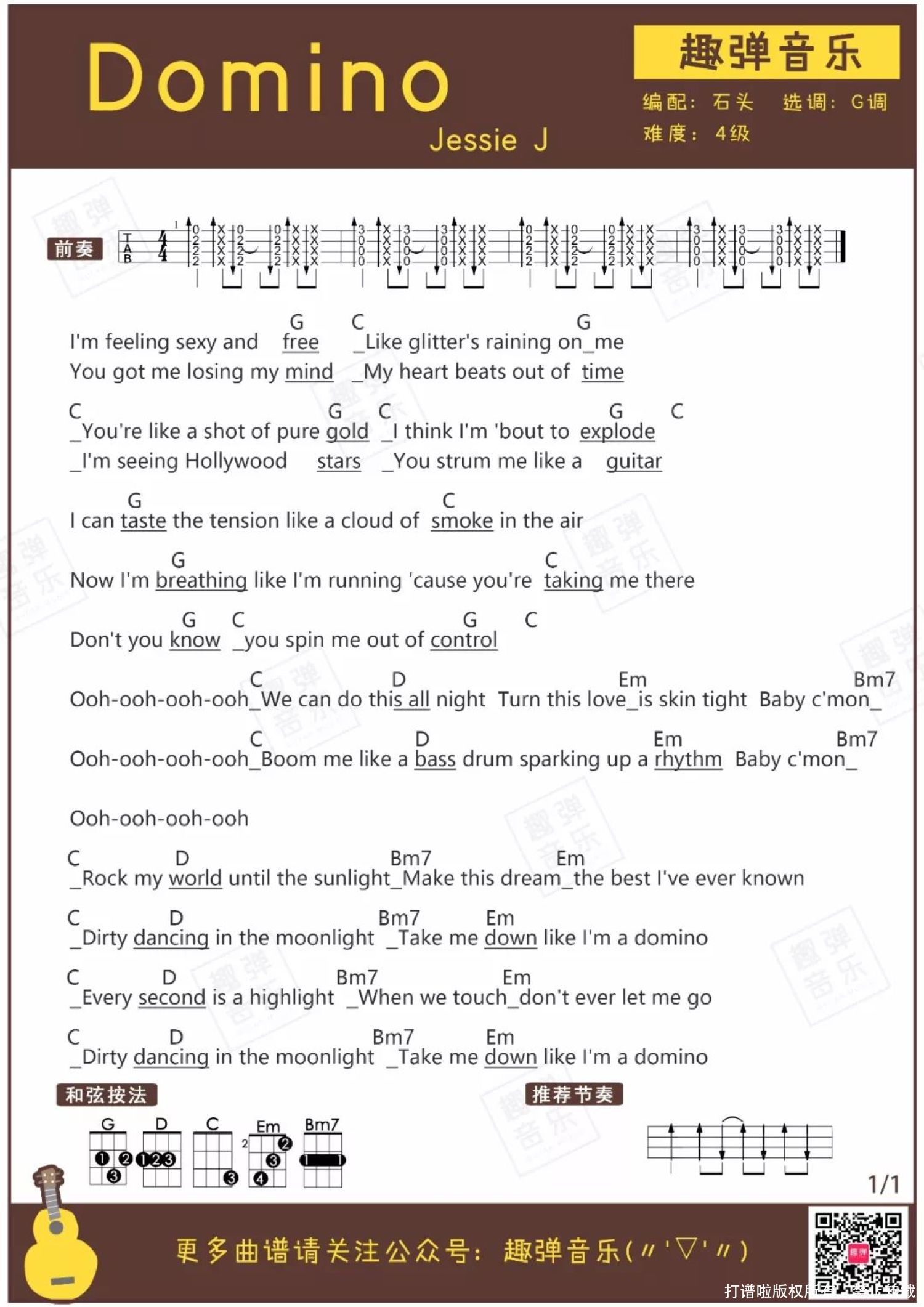 曲谱介绍: 《Domino》尤克里里弹唱谱 昨天晚上《我是歌手》第六季终于首播,各种“开口跪”、“耳朵怀孕”瞬间承包了热搜榜。 第一期中,张韶涵作为串场主持带来了亮眼表现,嘻哈歌手GAI点燃全场,汪峰一改摇滚来了一场深情演唱,还有意想不到的黑马出现…… 而夺得冠军的Jessie J被称作教科书级别的表演,稳定强大的唱功让大家直呼:这个冠军毫无悬念! Jessie J用自带立体音效果的嗓音带来了她自己的歌曲《Domino》,边唱边跳,歌舞两不误。 有人好奇导演花了多大功夫才请来这位曾在伦敦奥运会献唱的实力歌手的,一首歌就将《我是歌手》变成了格莱美现场,也让其他选手们感受到了一些压力。
