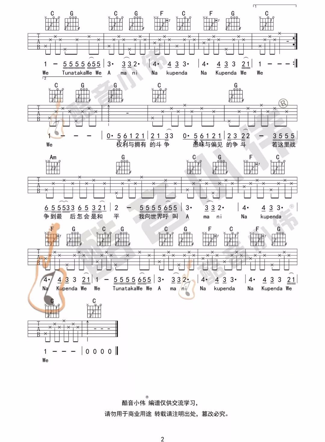 曲谱介绍: Beyond《Amani》吉他弹唱谱,采用C调指法编配,共有2张高清图谱,免翻页排版设计。