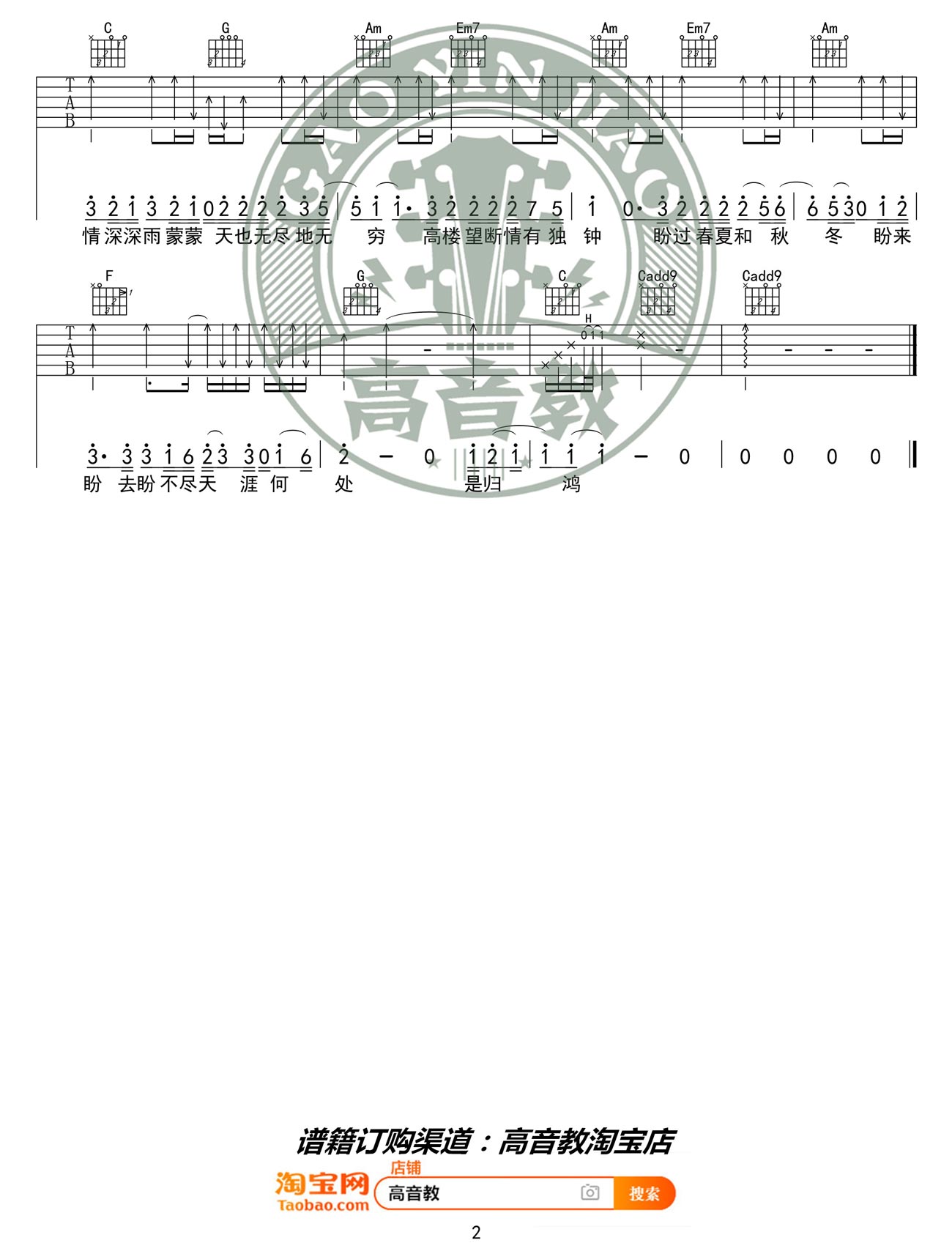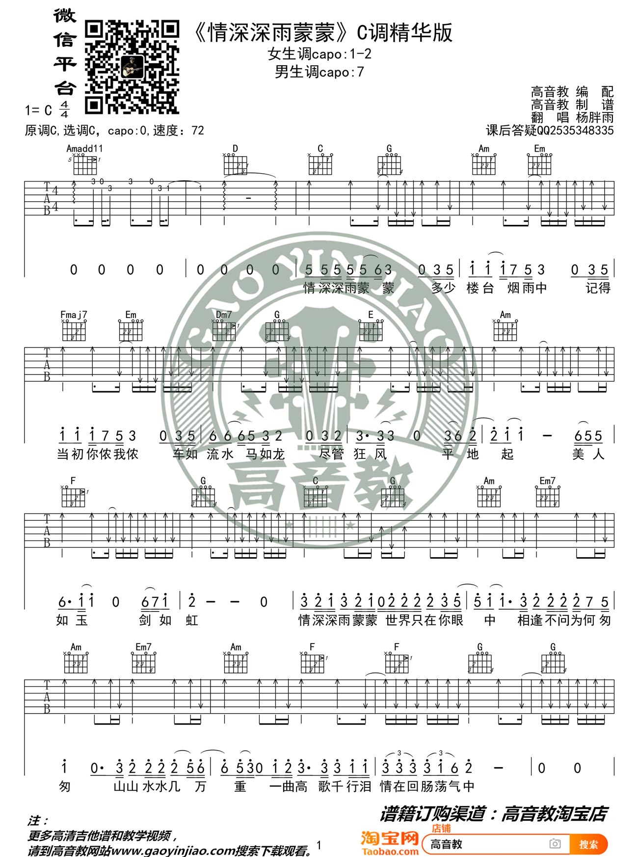 曲谱介绍: 杨胖雨《情深深雨蒙蒙》吉他弹唱谱,采用C调指法编配原版,共有2张高清图谱,免翻页排版设计。