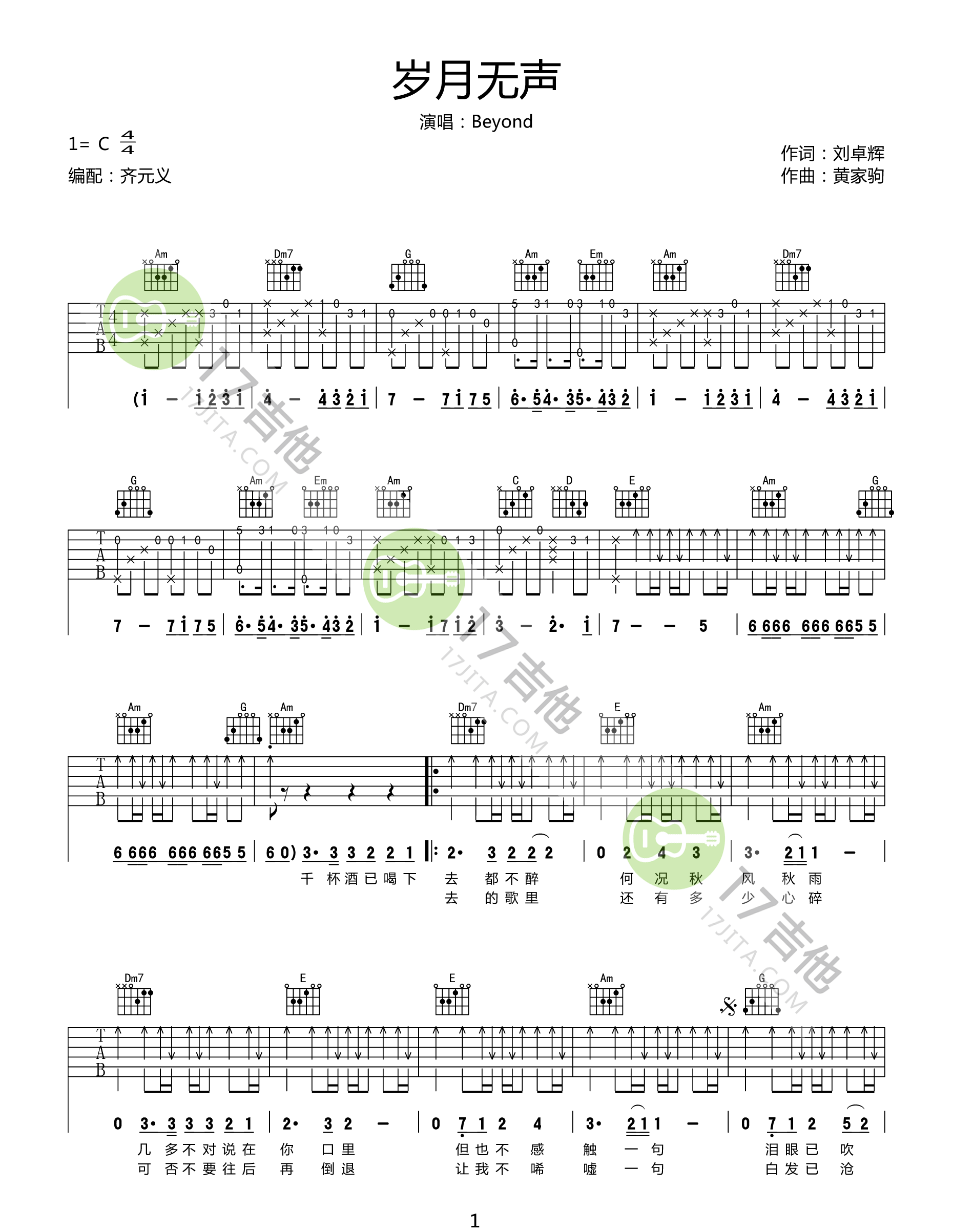 曲谱介绍: Beyond《岁月无声》吉他弹唱谱,采用C调指法编配原版,共有2张高清图谱,免翻页排版设计。
