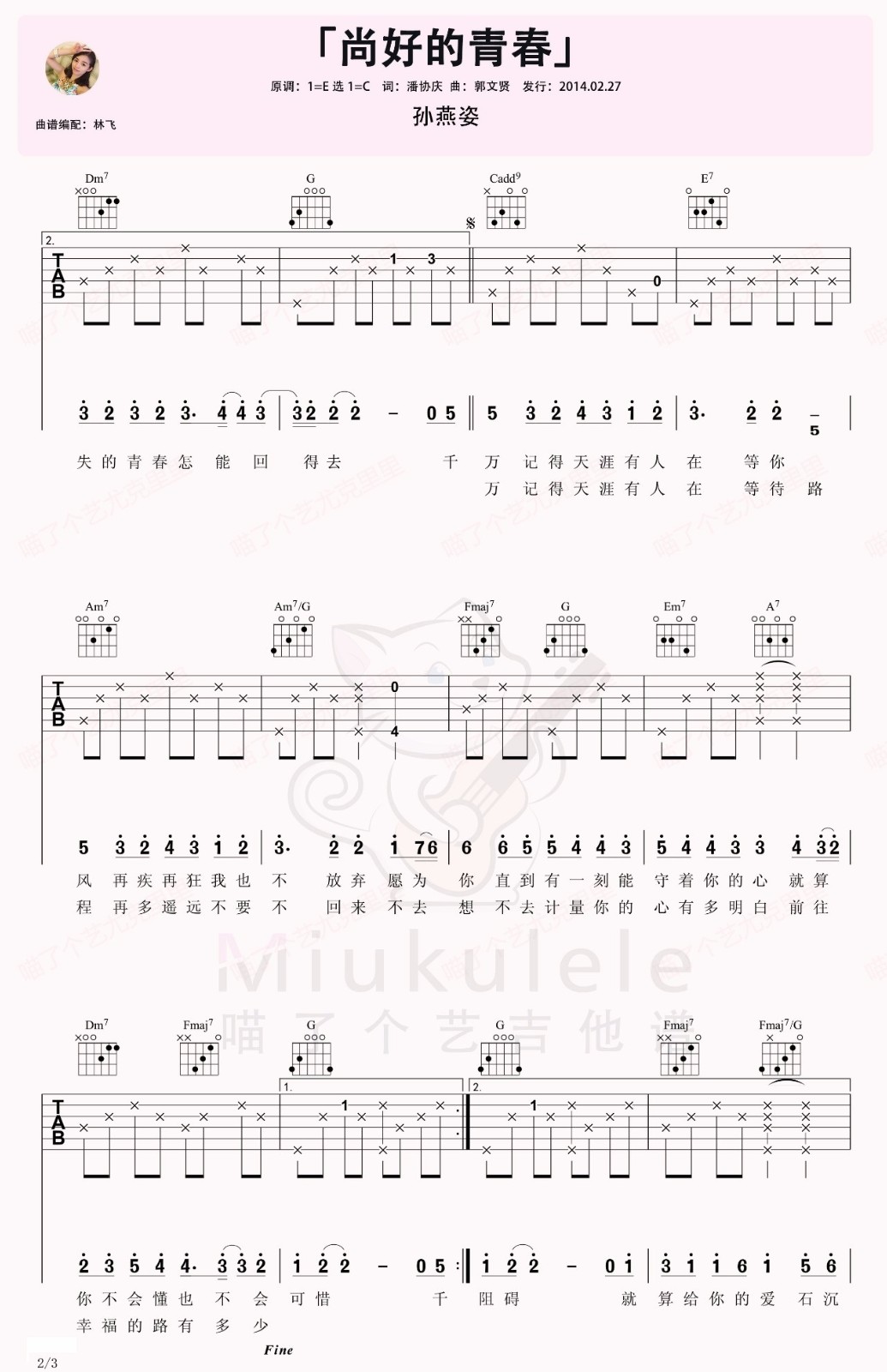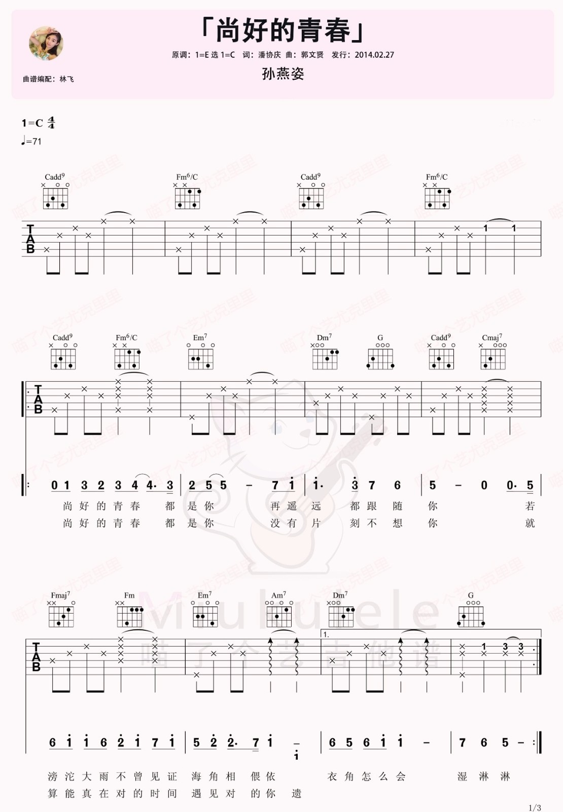曲谱介绍: 孙燕姿《尚好的青春》吉他弹唱谱,采用C调指法编配原版,共有3张高清图谱。